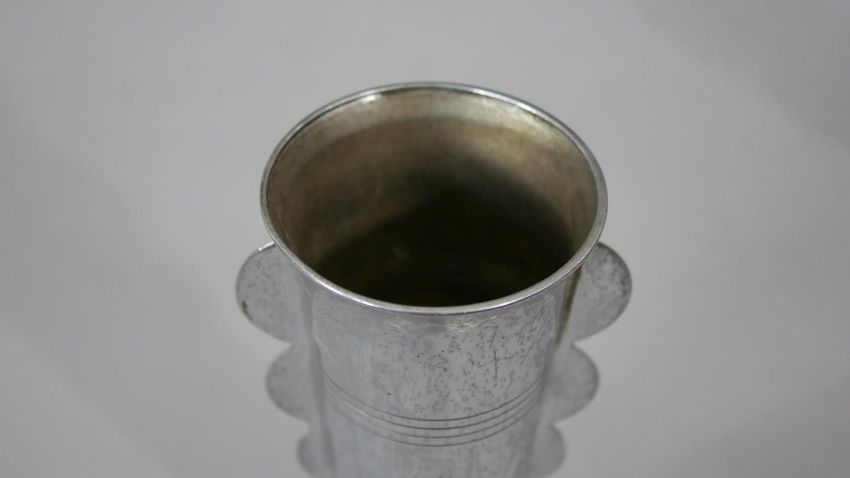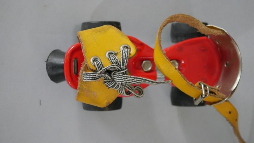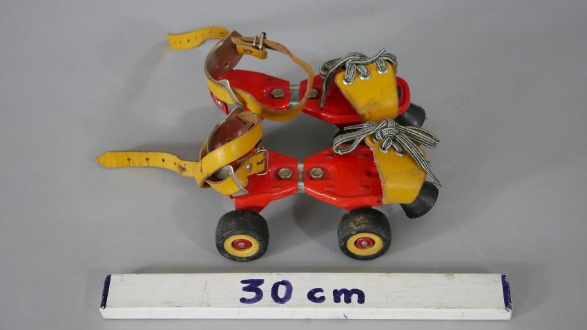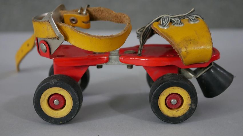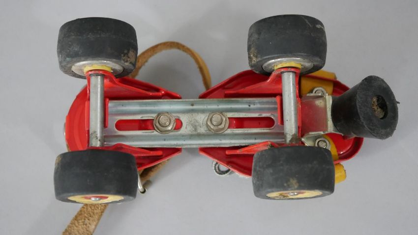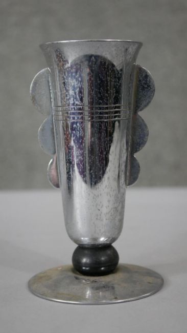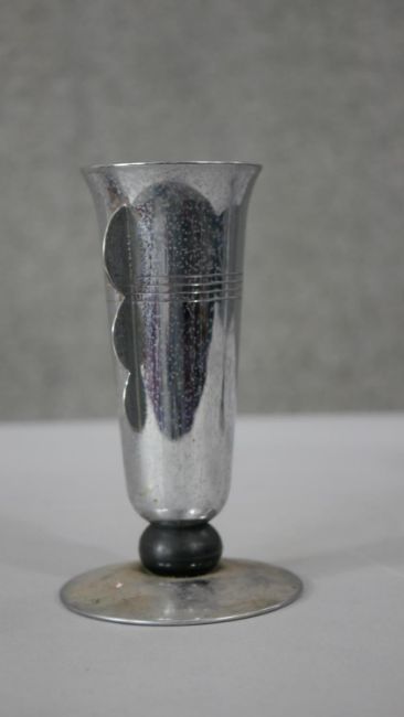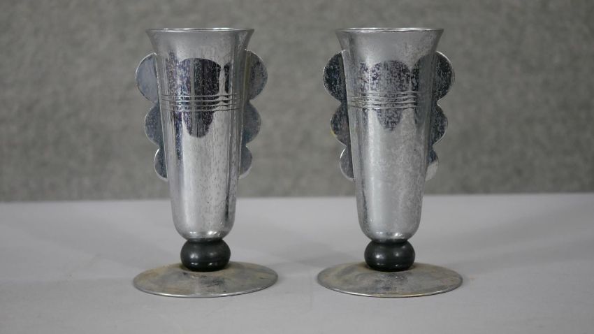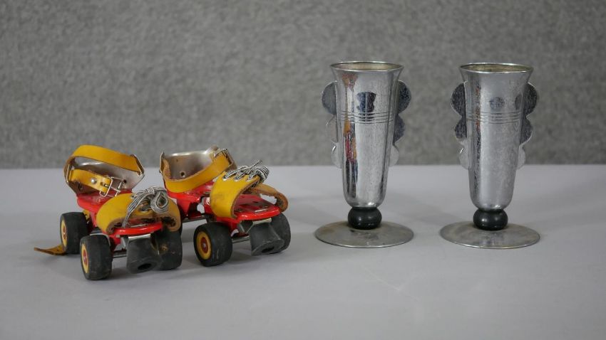 A pair of Art Deco chromed and Bakelite goblets along with a pair of vintage tinplate childrens roller skates. H.18 Diam.10cm (largest)