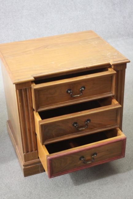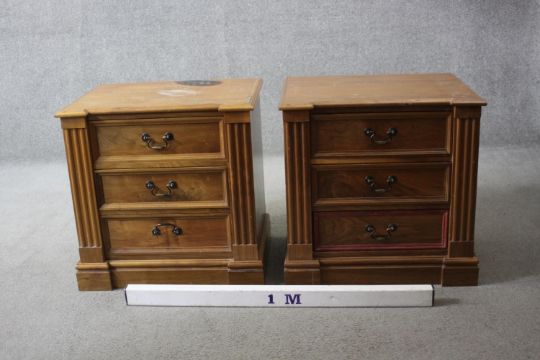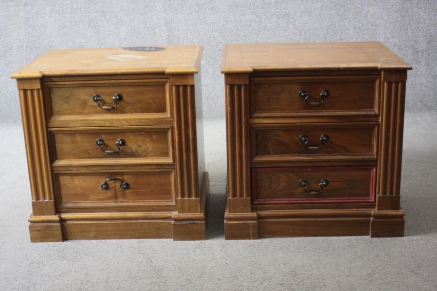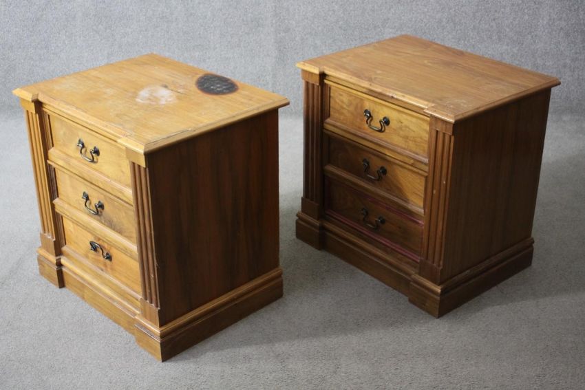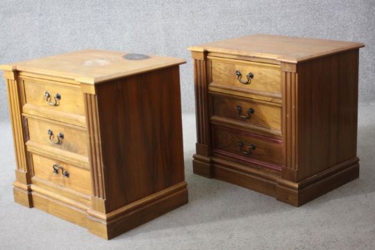 A pair of modern teak three drawer bedside cabinets. H.64 W.64 D.50 cm.