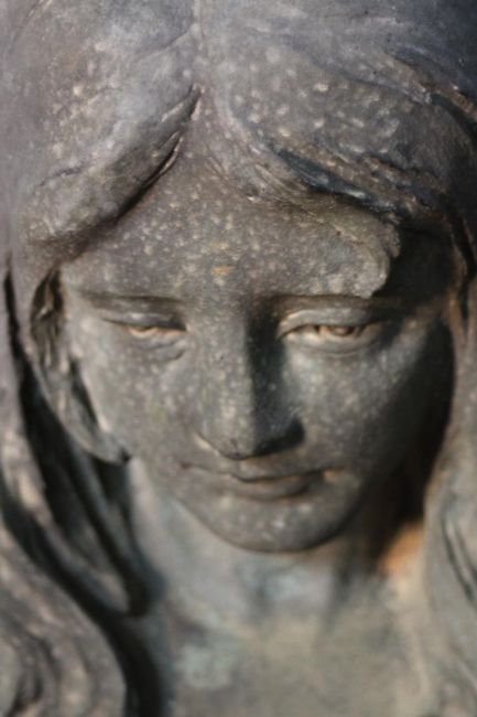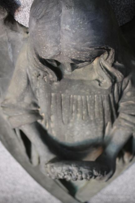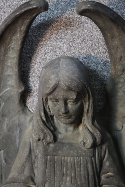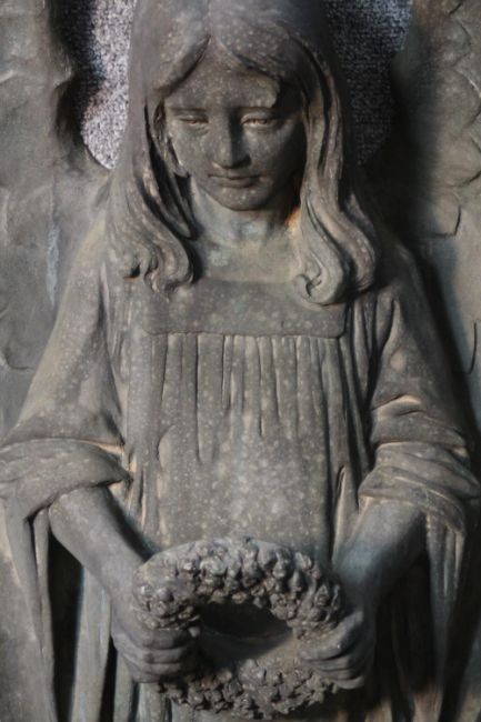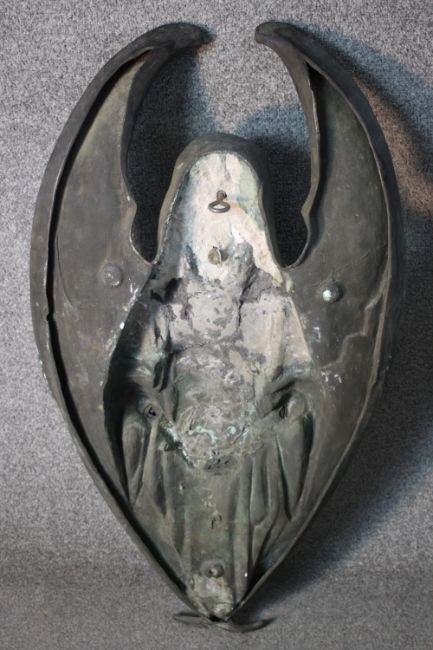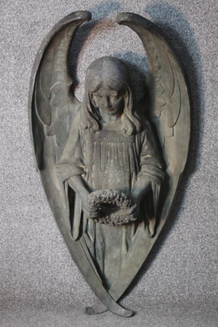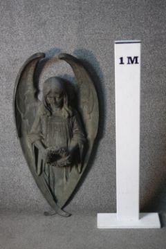A large early 20th century wall mounted bronze angel statue. The angel holding a flower wreath. H.90 W.47 D.24cm.