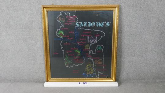 A framed and glazed painted map of Bangladesh with glitter detailing and illustrations. Artists label to the front. H.105 W.97cm