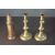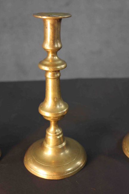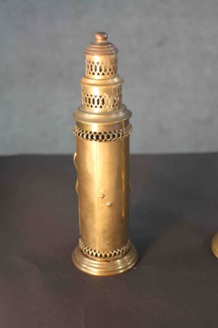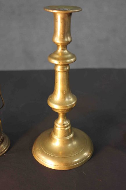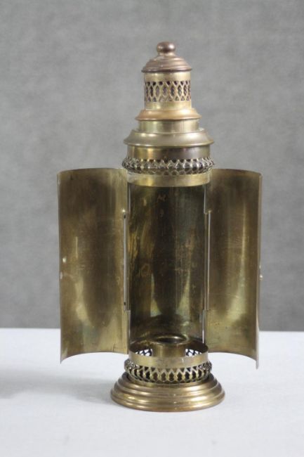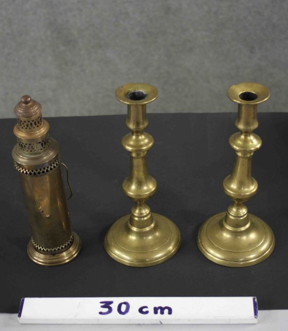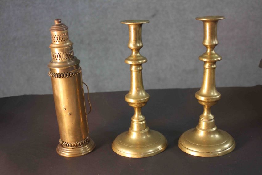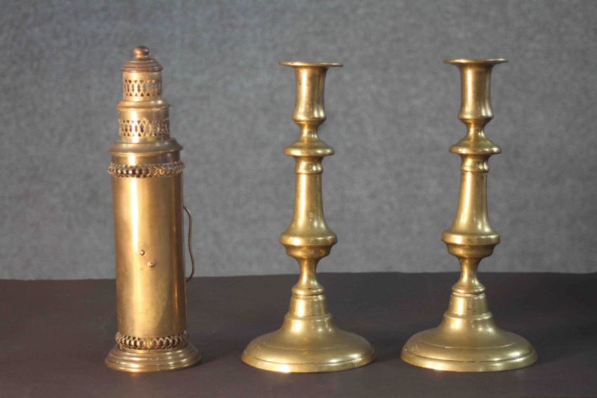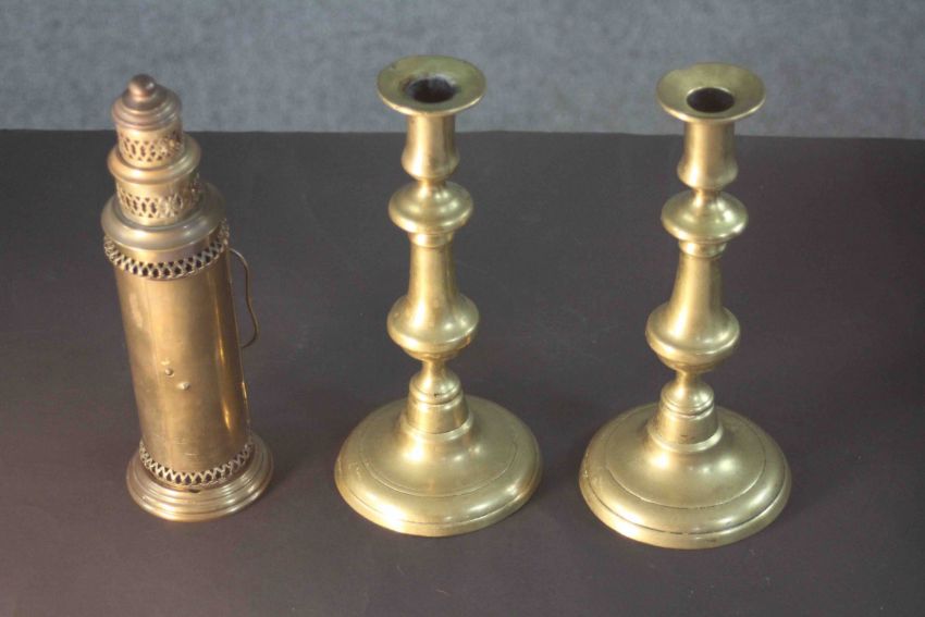 A pair of early 20th century brass candlesticks along with a portable brass candlestick lantern with pierced design. H.28 Diam.8 cm