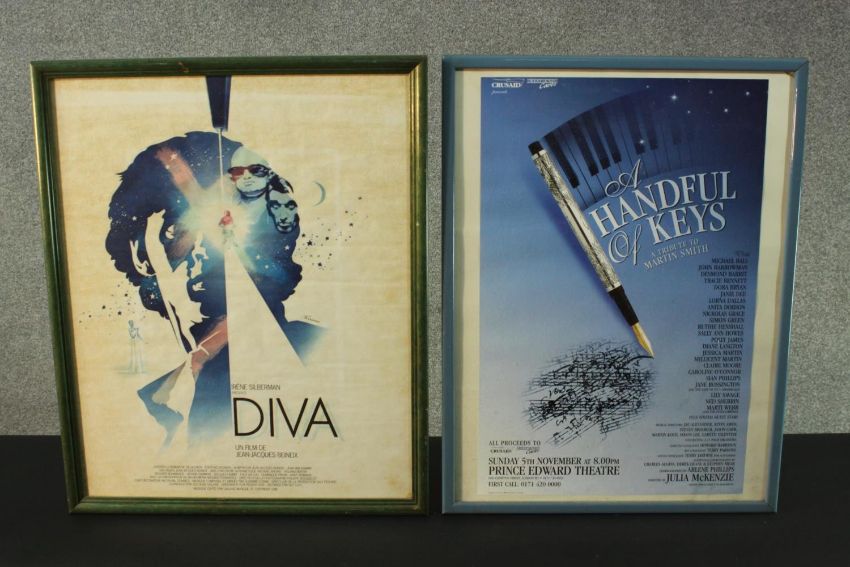 Two framed and glazed coloured posters. One for the French film Diva the other for a musical tribute. H.54 W.40cm.