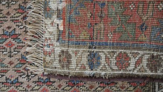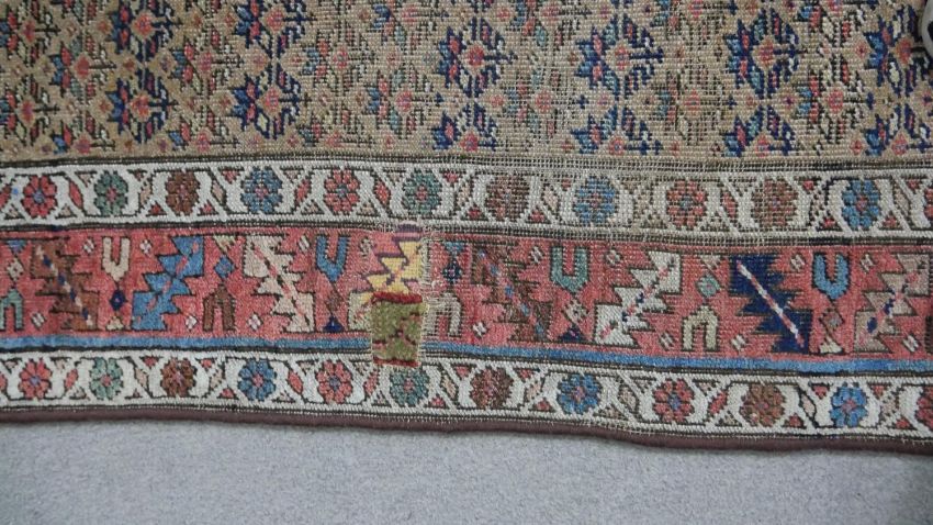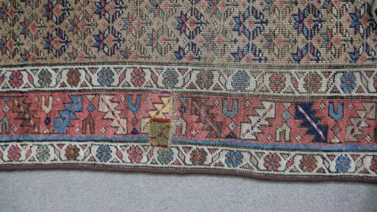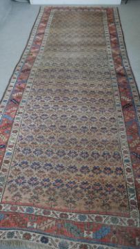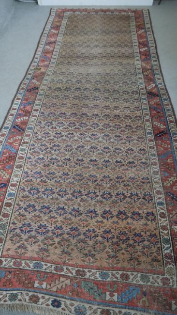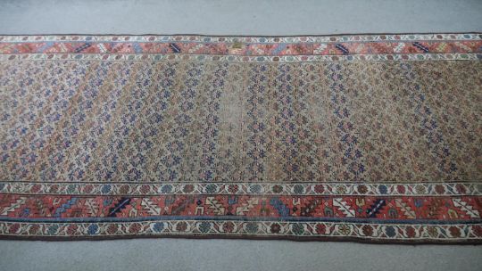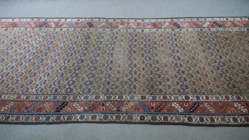 A Caucasian runner with repeating stylised floral motifs across the biscuit ground within serrated palm and flowerhead borders. L.351 W.122cm
