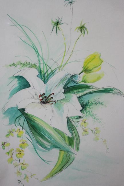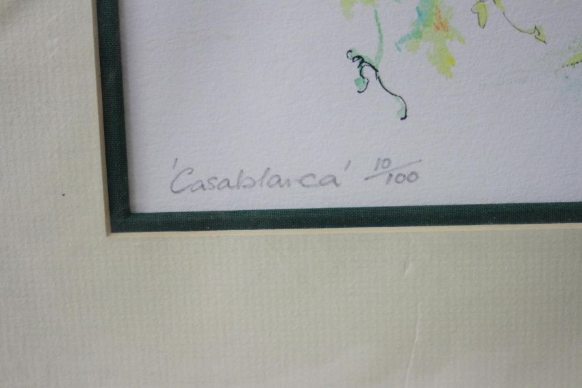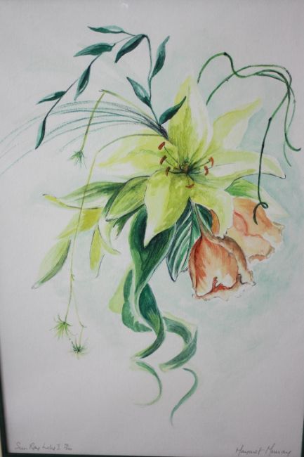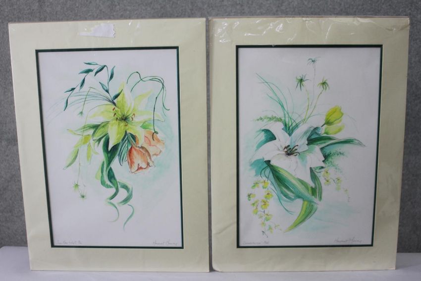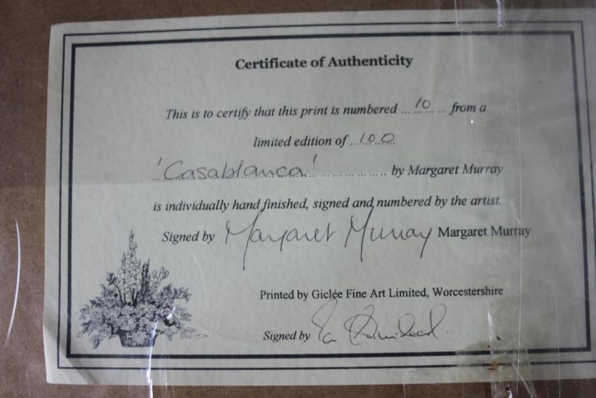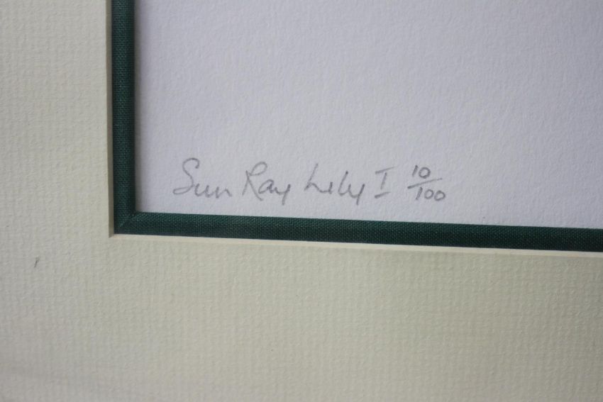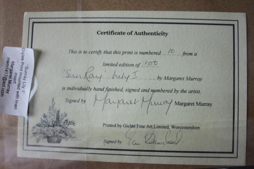 Margaret Murray- Two signed prints of floral compositions. Signed by artist. 'Sunray Lily 1' and 'Casablanca'. Each with certificate of authenticity. H.71 W.52cm.