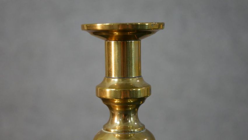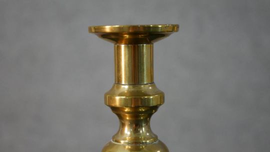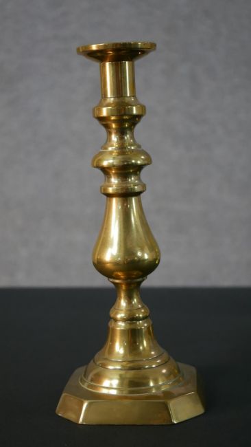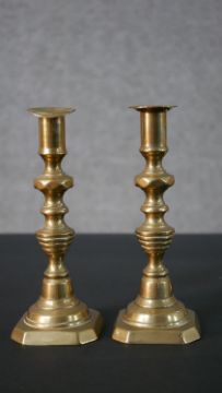 Two pairs of early 20th century brass candle sticks, one set with octagonal bases. H.27.5 W.11.5 D.11.5cm