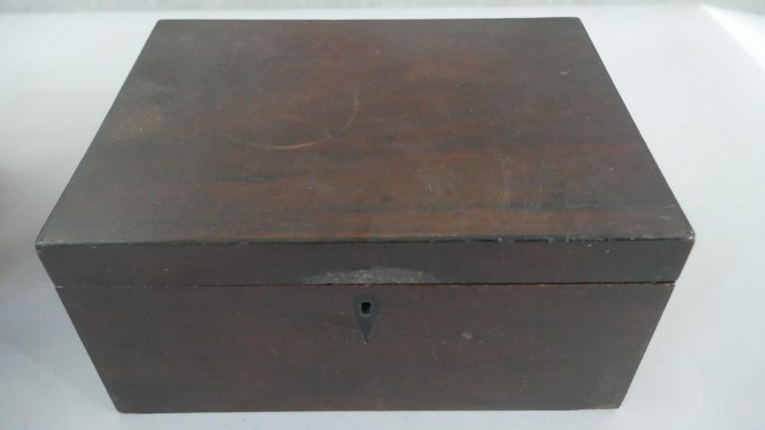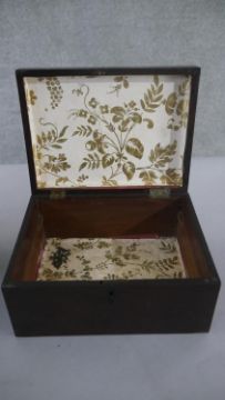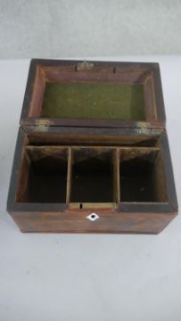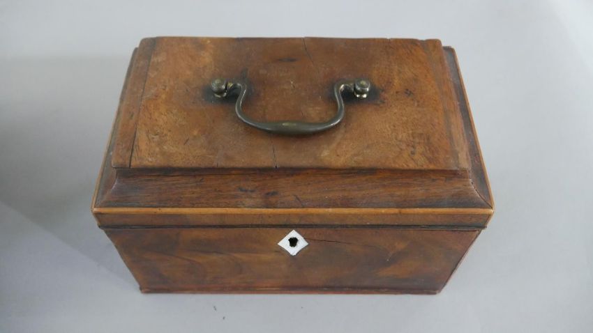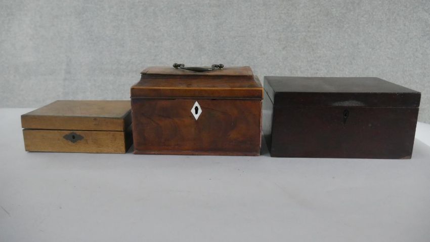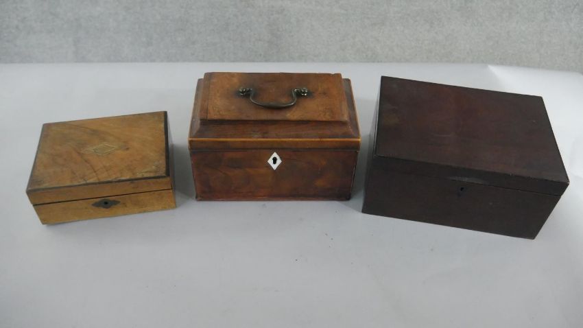 Three boxes, including a Regency mahogany tea caddy with three sections to the interior, a Victorian walnut sewing box, and another. H.12 W.26cm (largest)