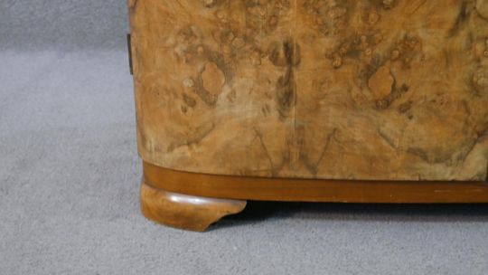 An Art Deco figured walnut compactum wardrobe, with two quarter veneered doors, the fitted interior with a hanging section and labelled drawers. H.159 W.84 D.43cm