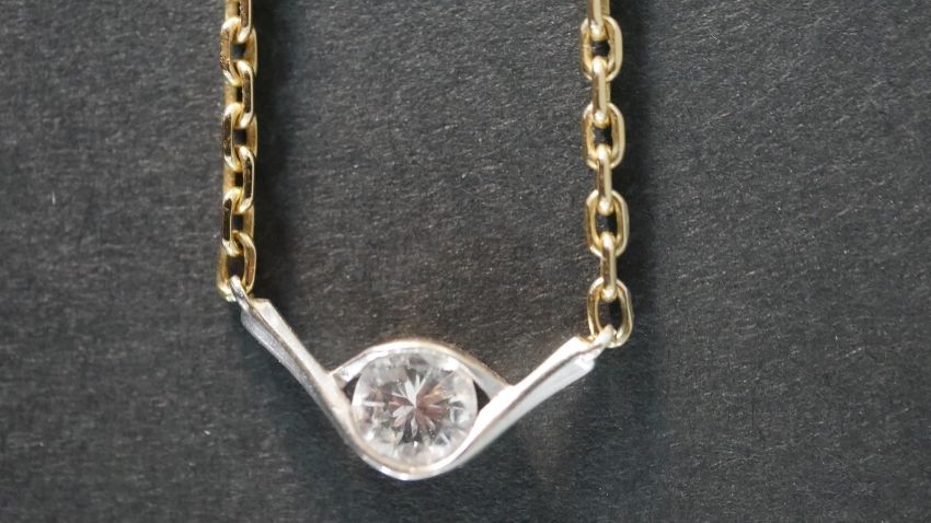An 18 carat white and yellow gold bar and trace chain link necklace, set with a round brilliant cut diamond with an approximate carat weight of 0.57 carats, set within a 18 carat white gold eye shape mount, the necklace articulated, stamped 750, 18ct with makers mark. Gross weight 9g