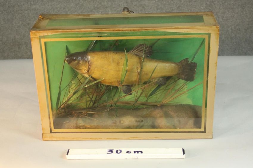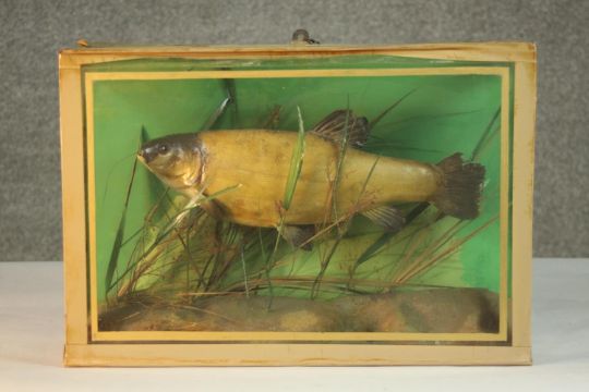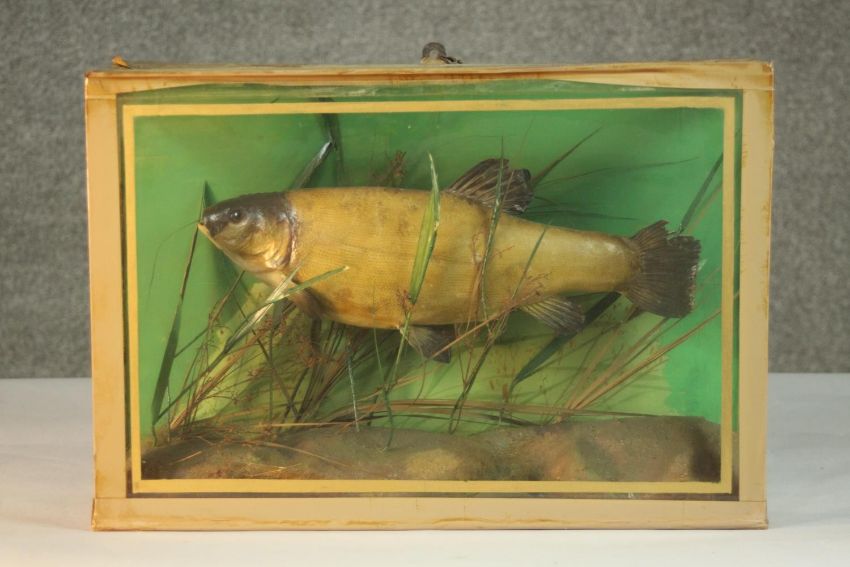 An early 20th century taxidermy Tench in a glazed display case with naturalistic interior H.32 W.46 D.15cm.