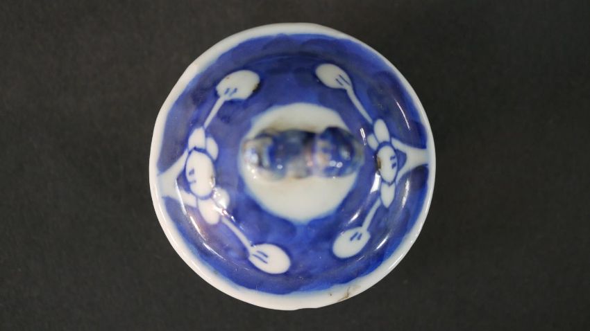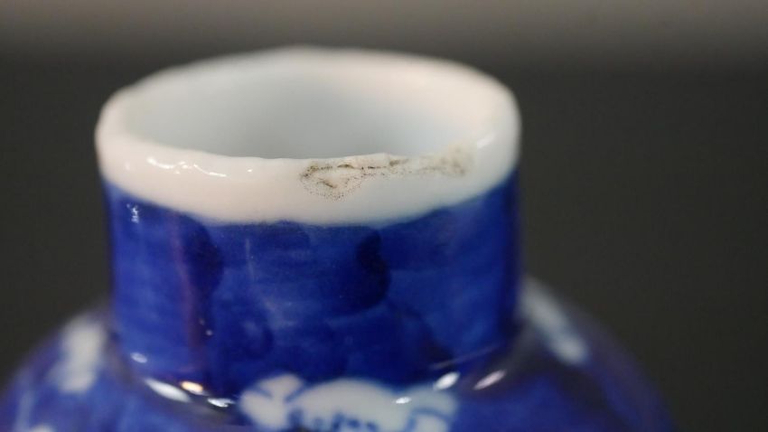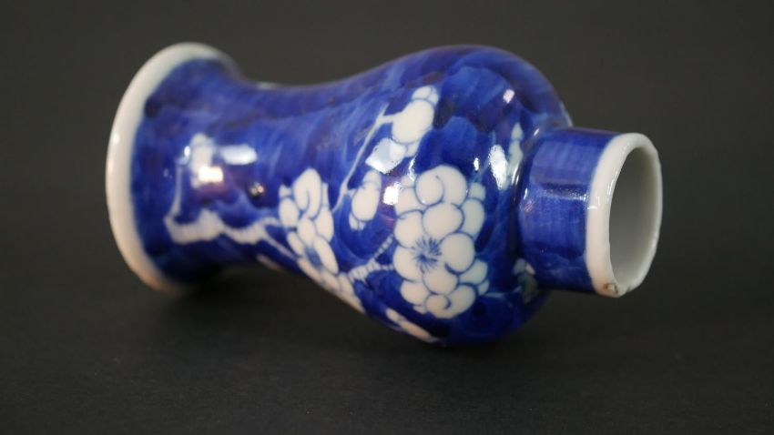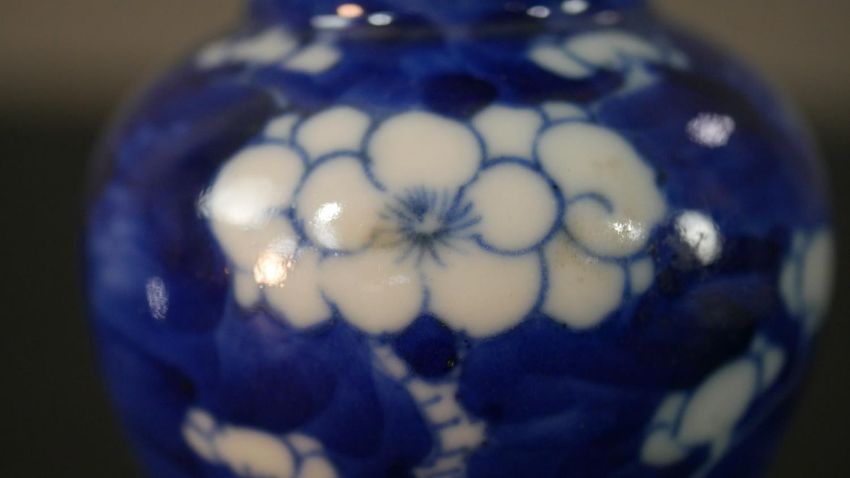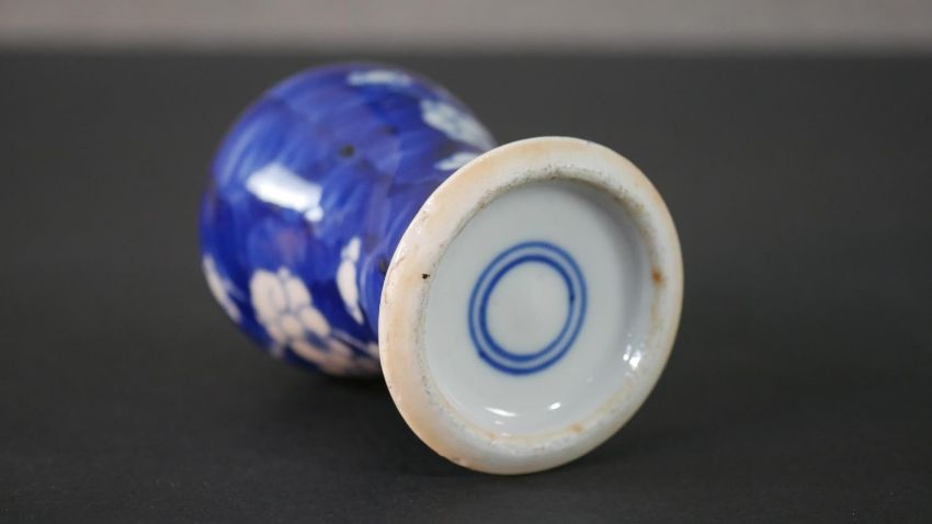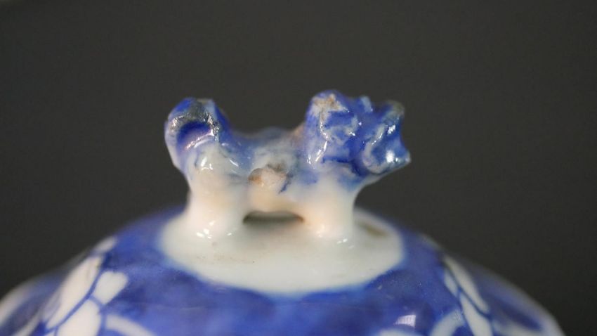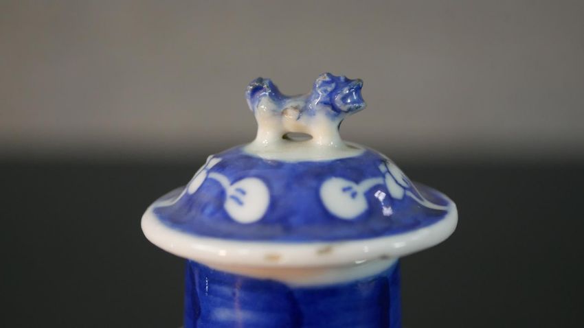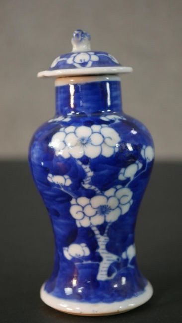 An Chinese blue and white hand painted prunus blossom design ceramic lidded vase. H.13.5 Diam.6cm