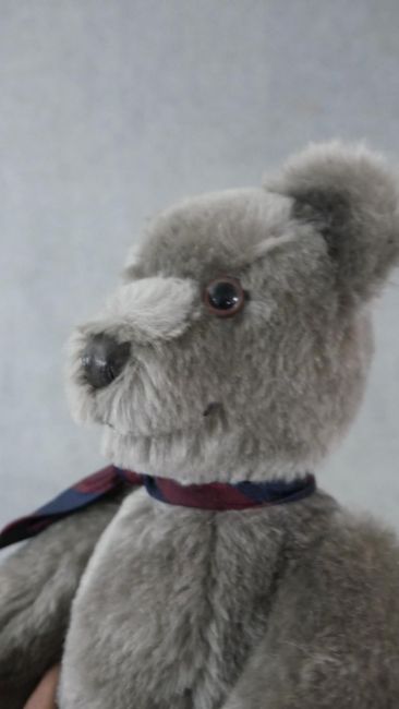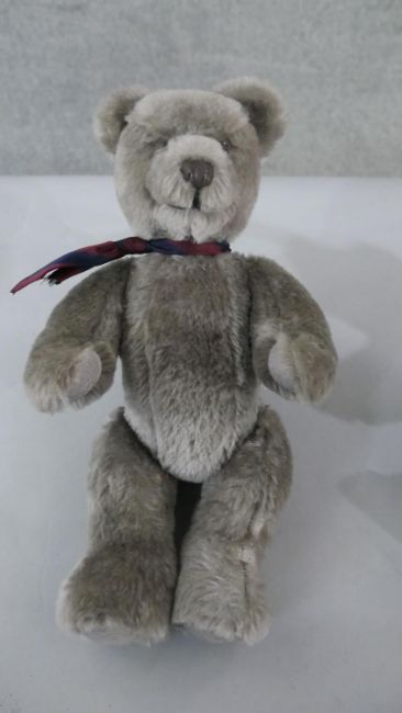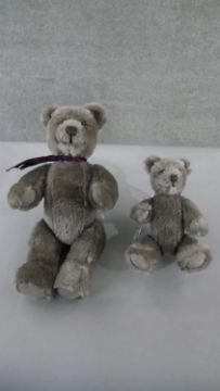 Two 20th century grey mohair jointed teddy bears, with suede pads. H.43 W.23cm (largest)