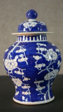 A pair of 19th century blue and white hand painted Chinese prunus blossom design lidded ginger jars, with blue double circle mark to the base. H.27 W.18cm