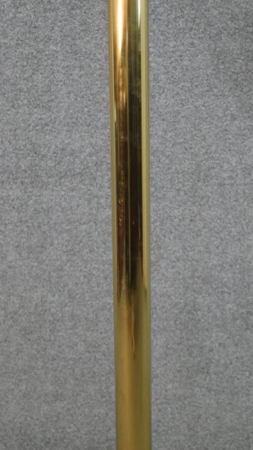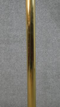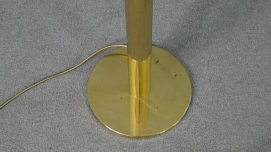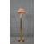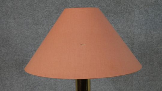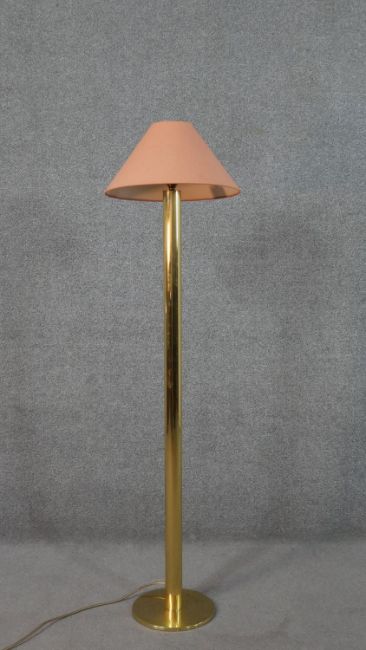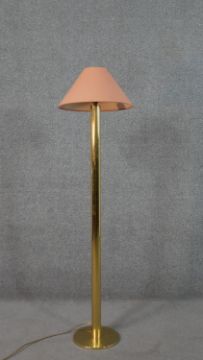 A brass standard lamp, with a salmon coloured shade, on a cylindrical stem with a circular base. H.143 Diam.38cm