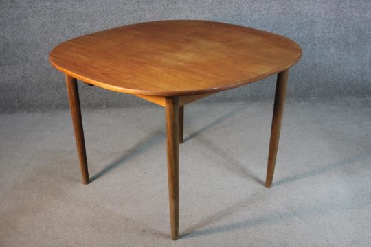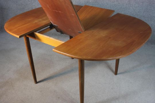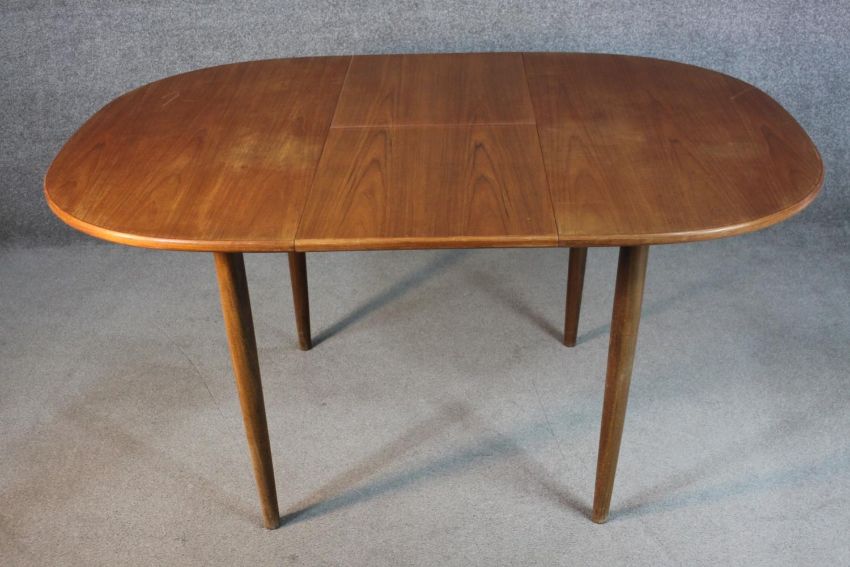 A circa 1970s G-Plan teak dining table, of eliptical form with a butterfly leaf, on tapering cylindrical legs, bearing label. H.72 W.150 D107cm.