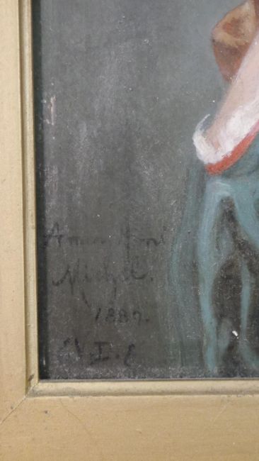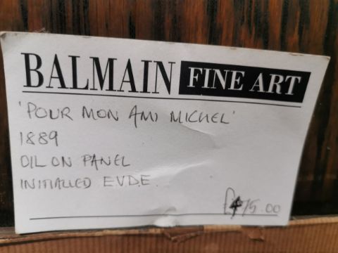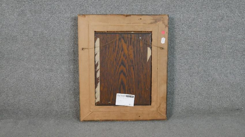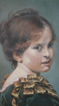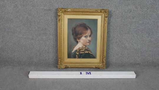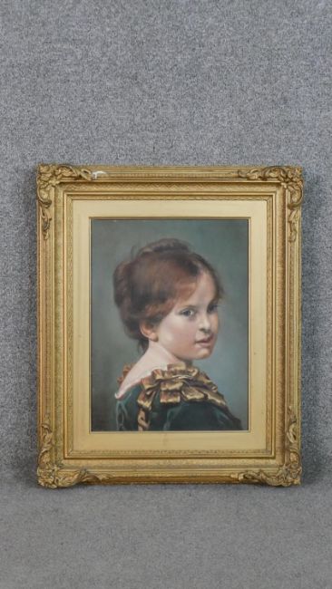 A gilt framed oil on board of a young girl in smart dress, inscribed and monogrammed by artist and label verso. H.60 W.48.5cm