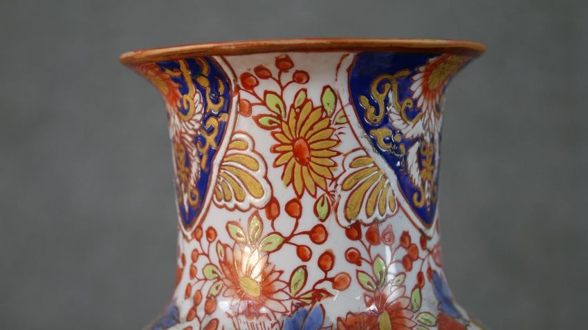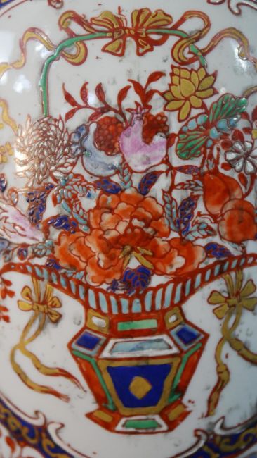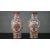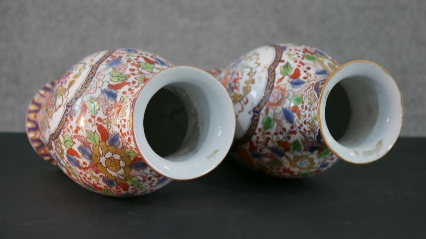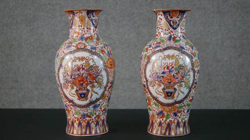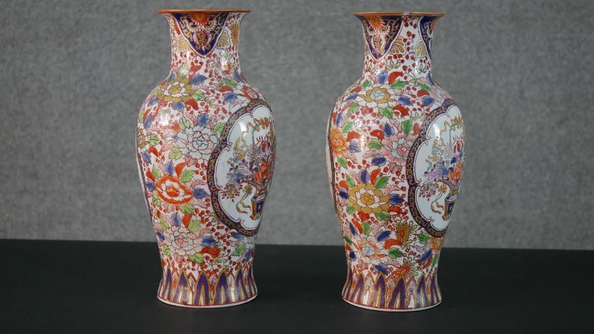 A pair of early 20th century Chinese hand painted vases with panels decorated with flower baskets and foliate motifs around the edge. Character marks to the base. H.37 Diam.16cm