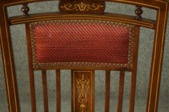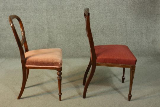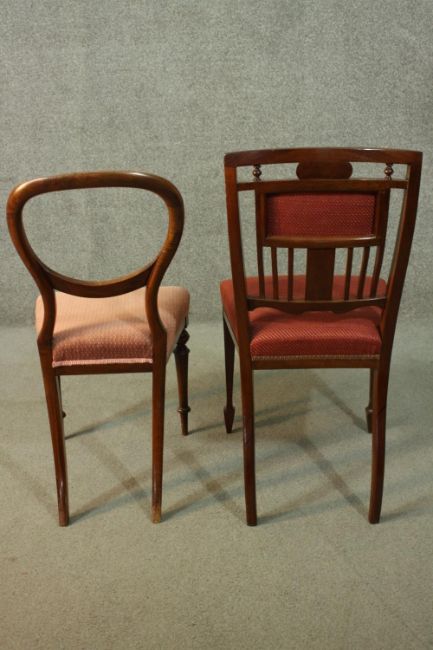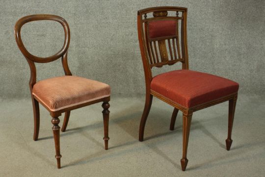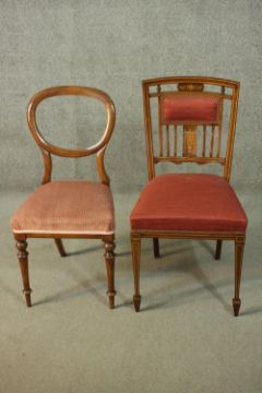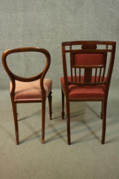 A Victorian mahogany balloon back dining chair, together with an Edwardian inlaid mahogany dining chair, both upholstered in red fabric.
