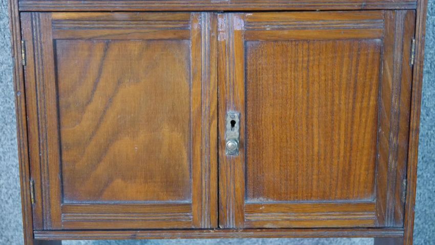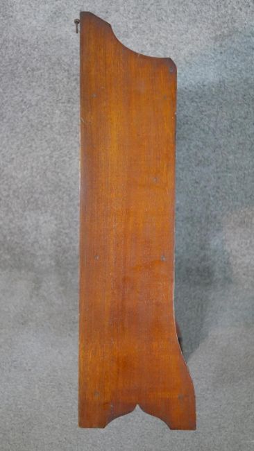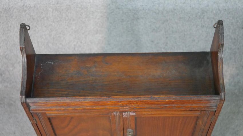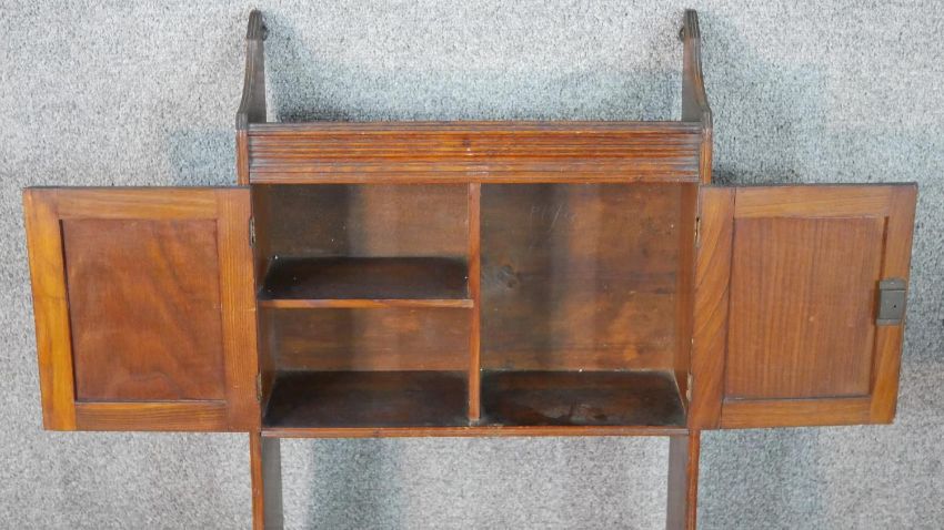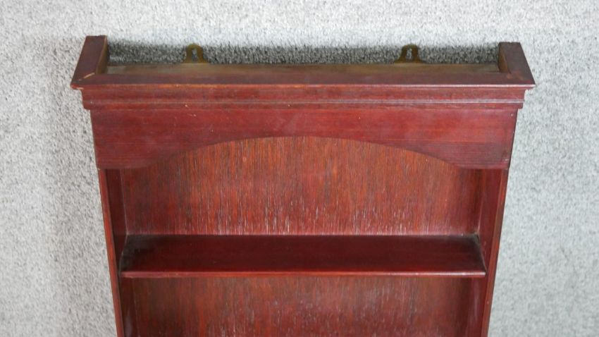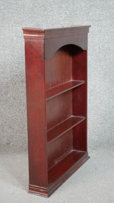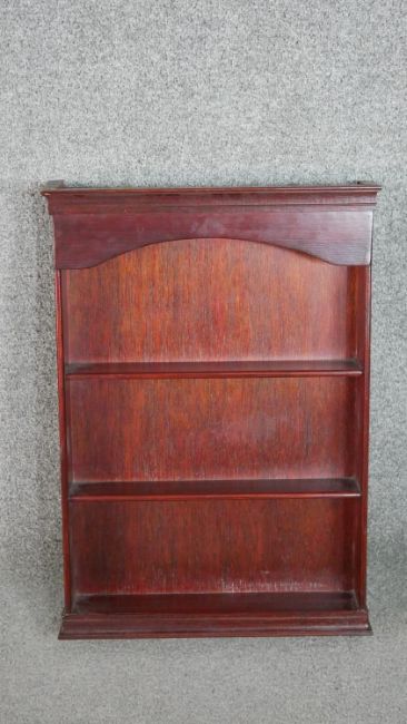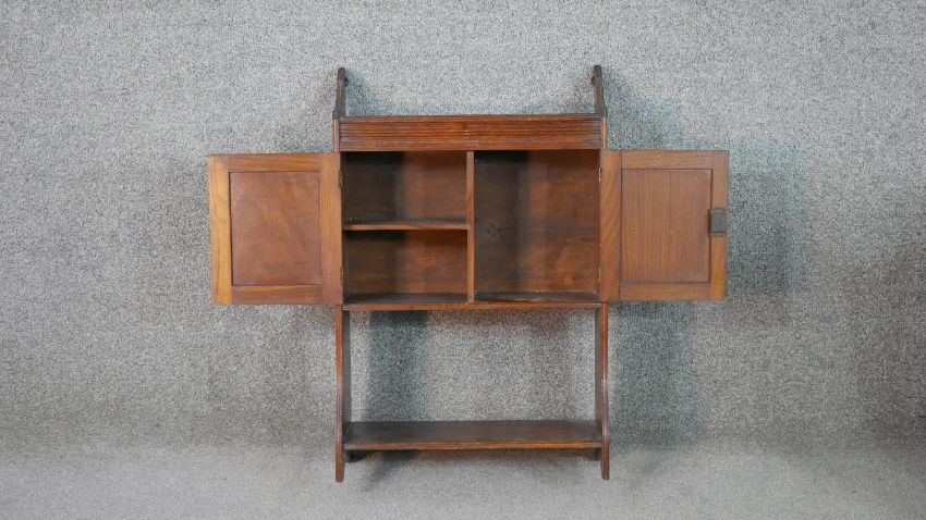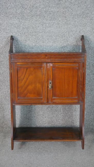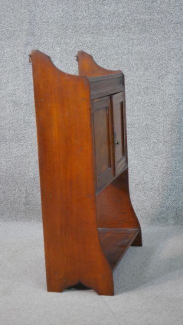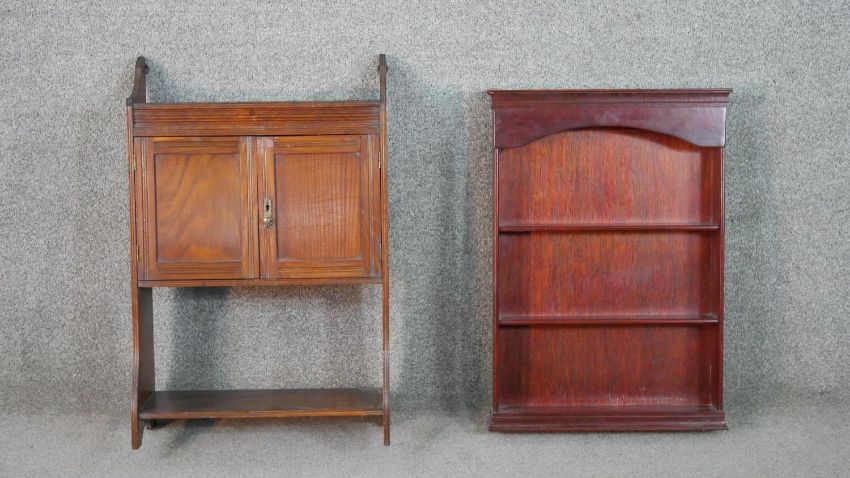 A late Victorian wall mounted cabinet, with two cupboard doors over an undertier, together with a bookcase with integral shelves. H.66 W.43 D.19cm (largest)