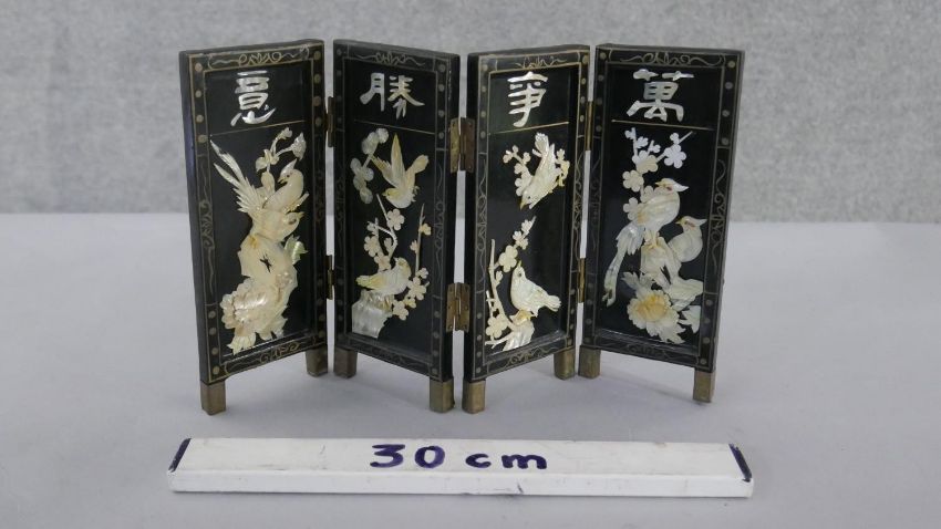 A miniature Japanese mother of pearl and lacquer folding screen. Decorated with birds, cherry blossom and characters. H.22 W.36cm