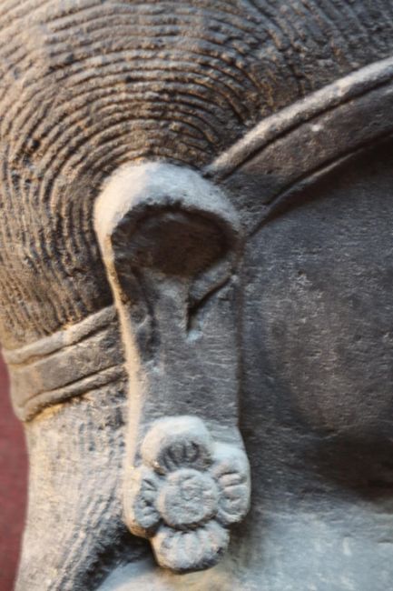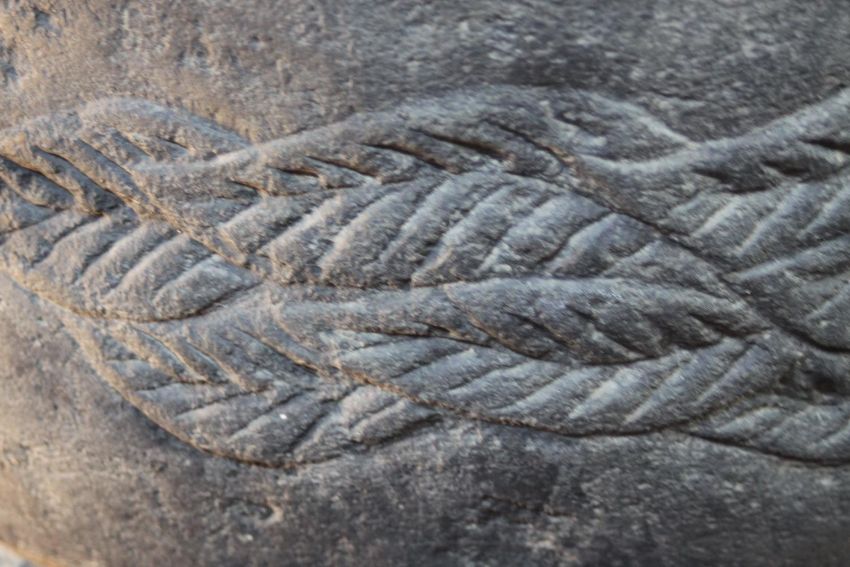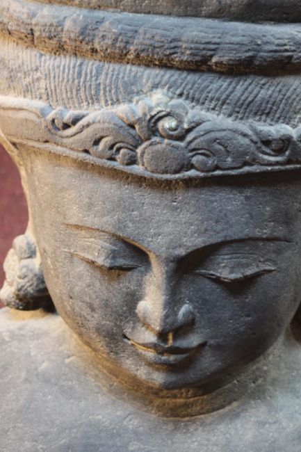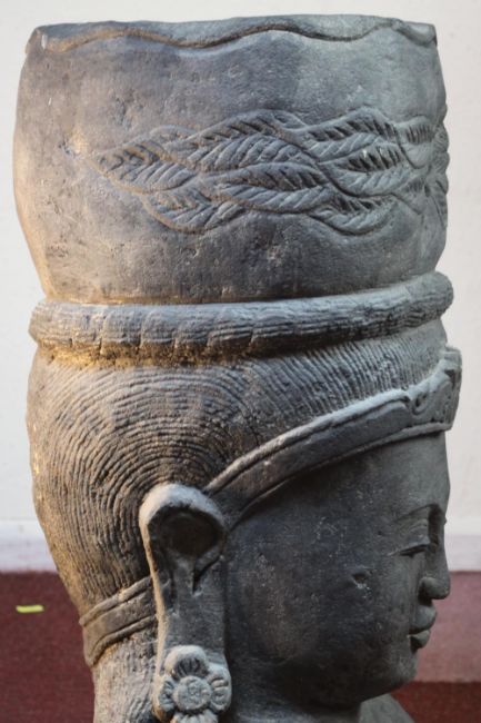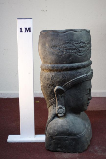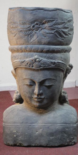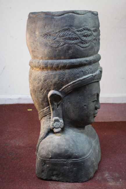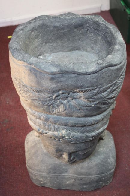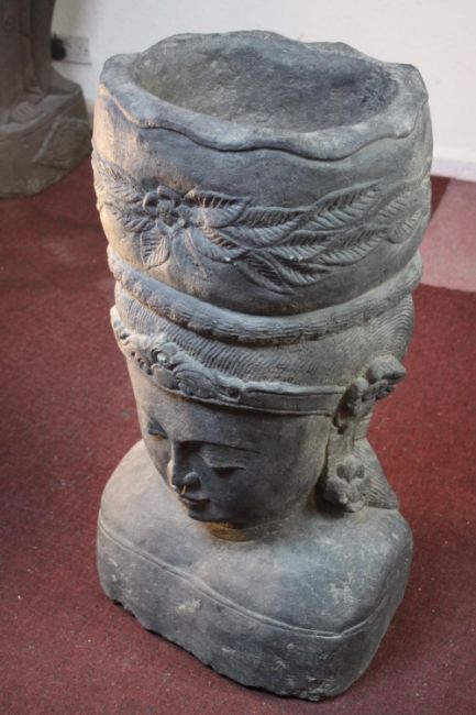 A very large 20th century Balinese Goddess carved stone head planter. H.92 W.48cm.