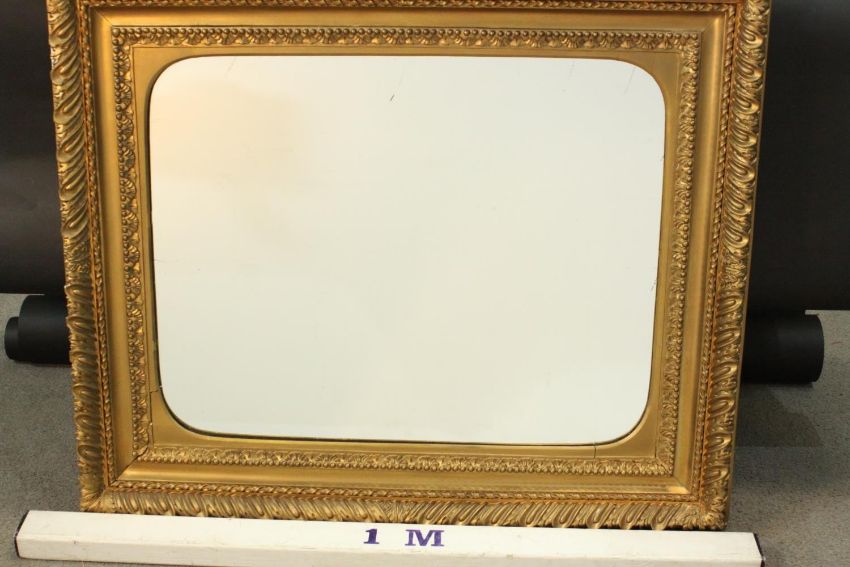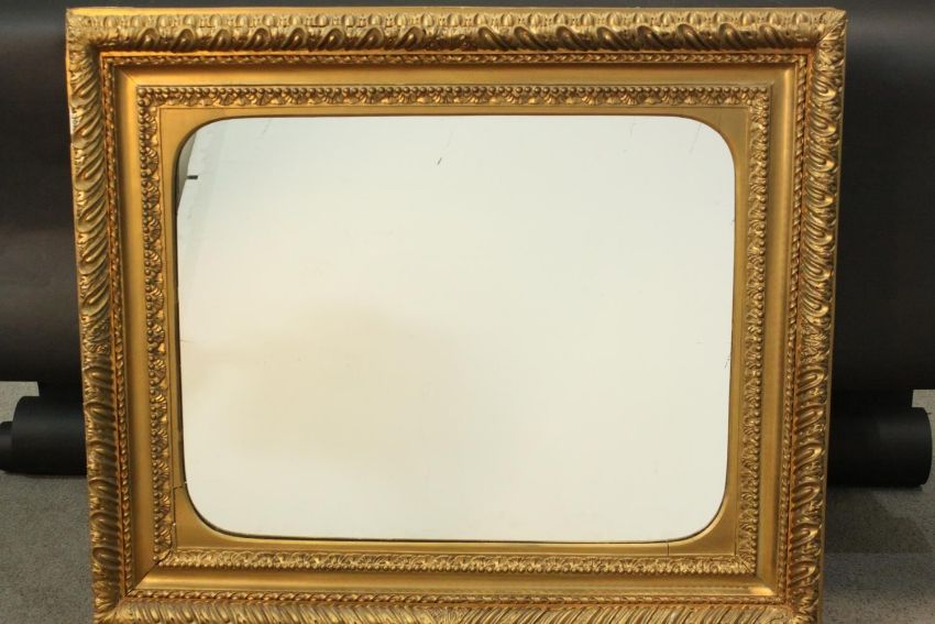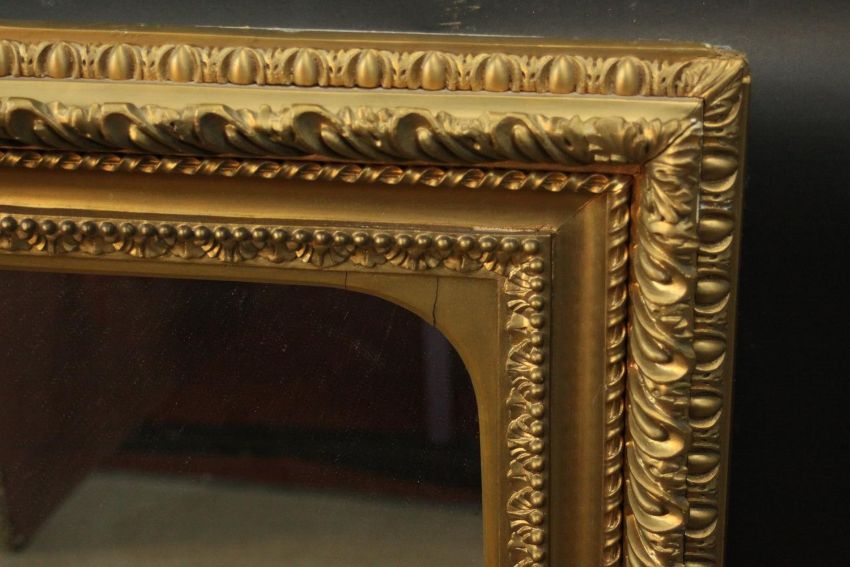 An early 20th century carved giltwood and gesso framed wall mirror. The frame decorated with stylised foliate and beaded design. H.78 W.90cm.