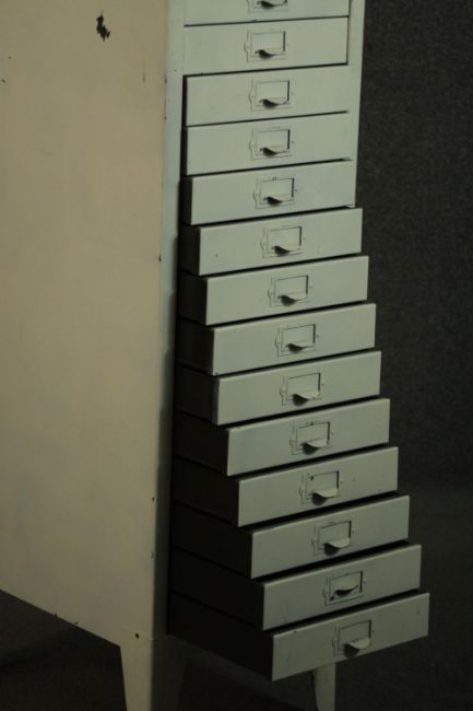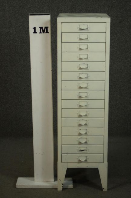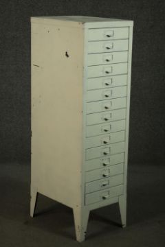 A 20th century white painted steel filing cabinet, with fifteen drawers, on tapering backet legs. H.100 W.29 D.39cm.