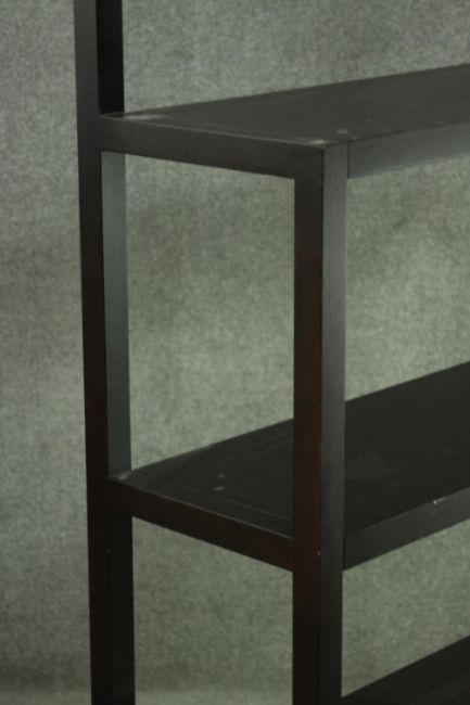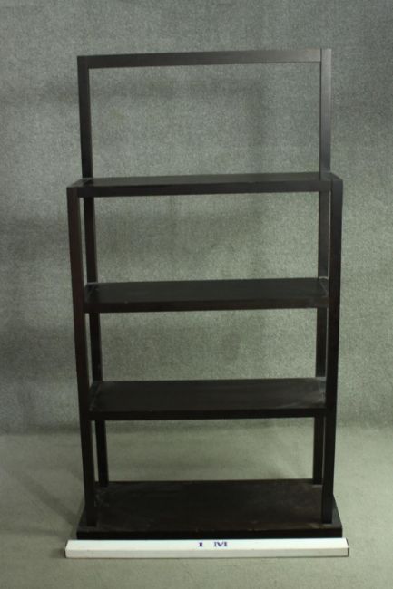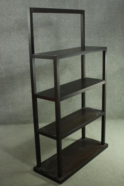 A contemporary ebonised oak shelving unit, with three shelves supported by square section supports, on a rectangular base. H.172 W.90 D.31cm