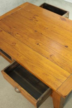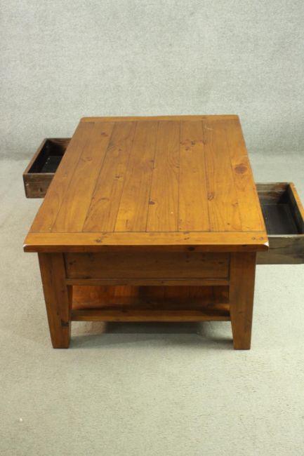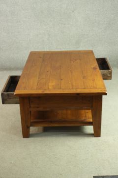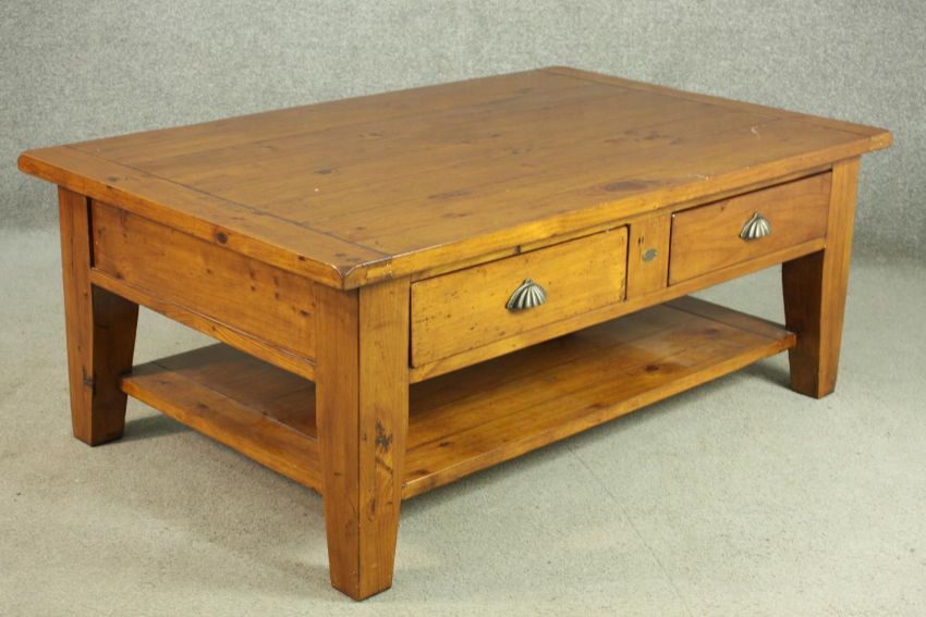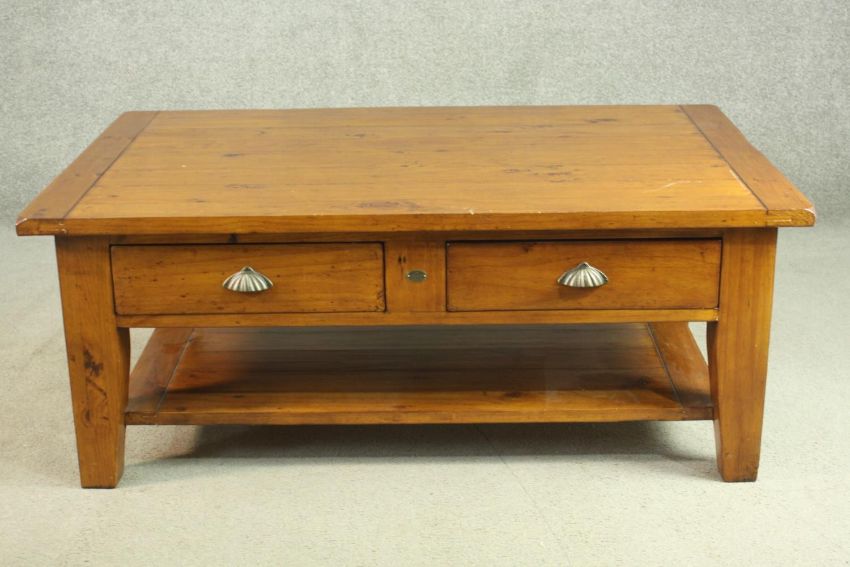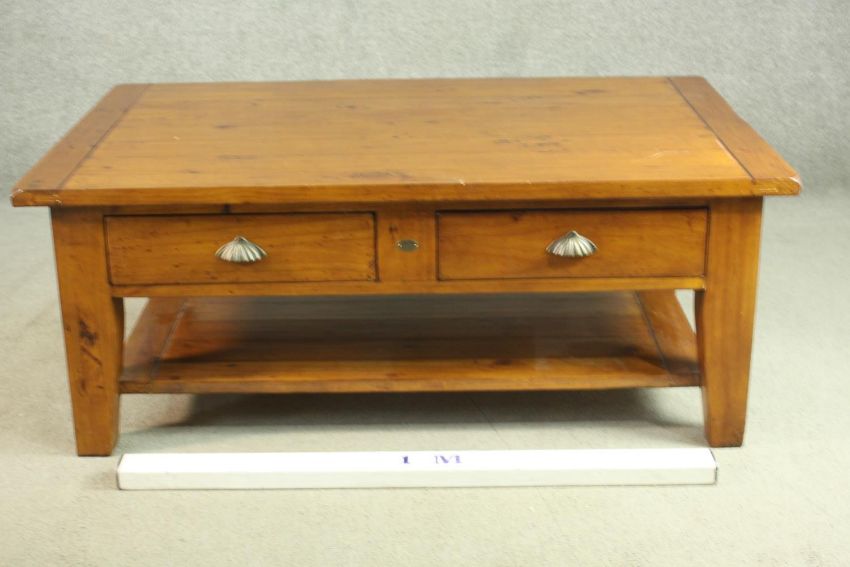 An Irish Coast Collection stained pine coffee table, the rectangular top over two short drawers with shell handles, the square section legs joined by an undertier, with maker's label. H.50 W.128 D.82cm.