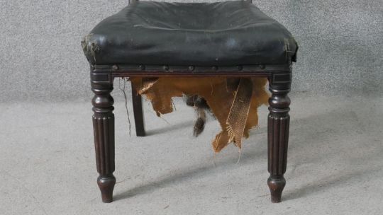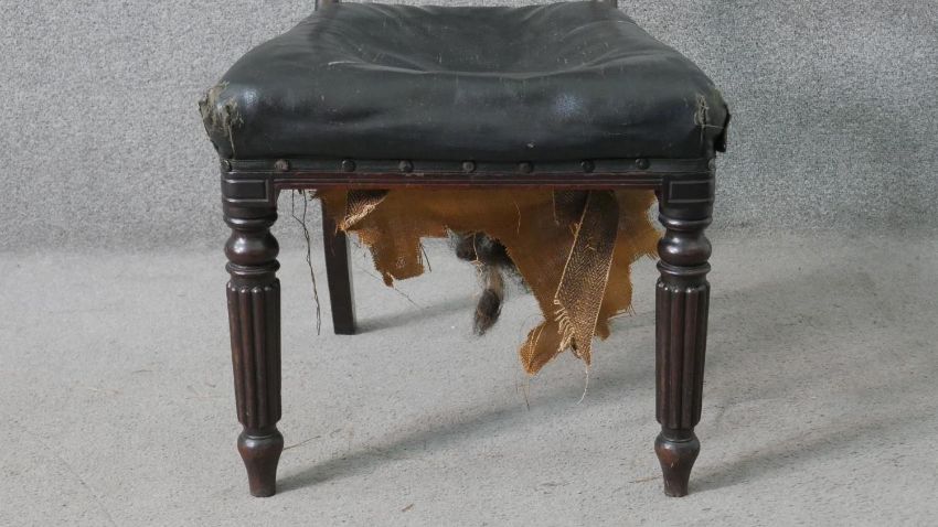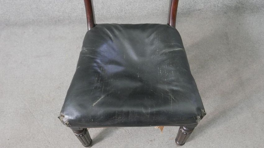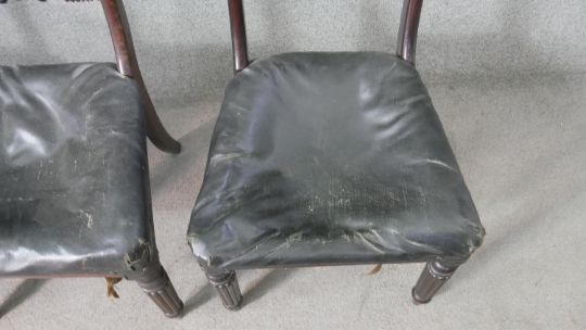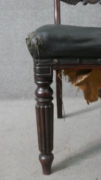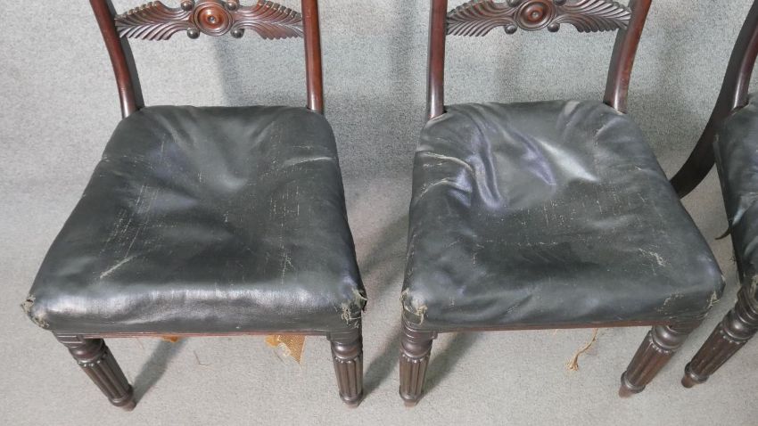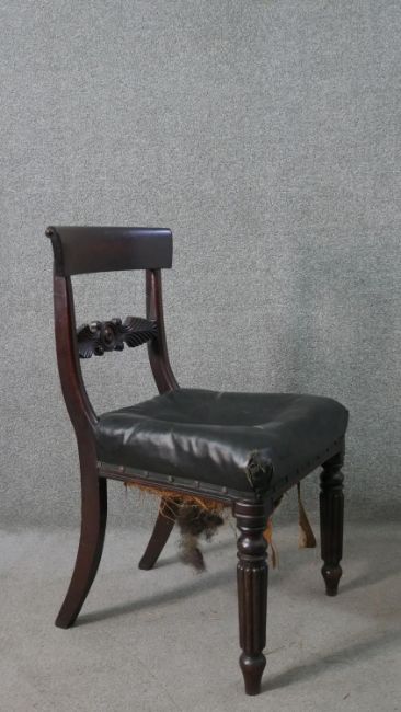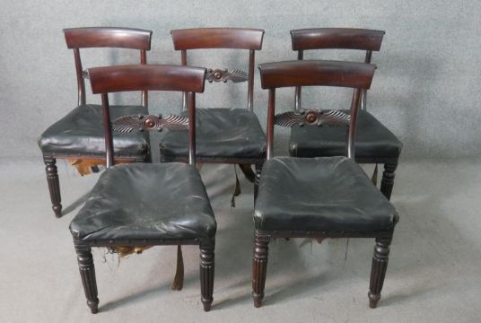 A set of five William IV mahogany bar back dining chairs, with a carved stylized fern backrest centred by a roundel, over a faux leather seat, on turned and reeded legs.