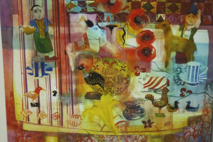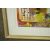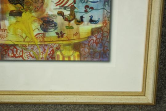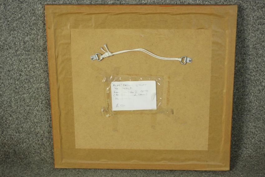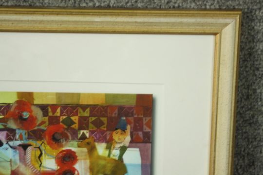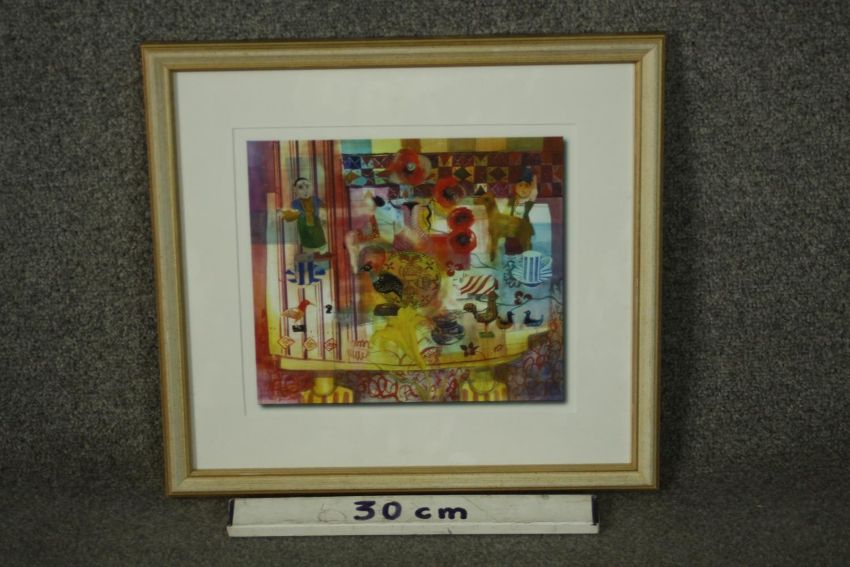 A framed and glazed print of a watercolour depicting figures and birds. Label verso. H.39 W.40cm.