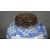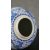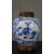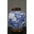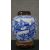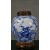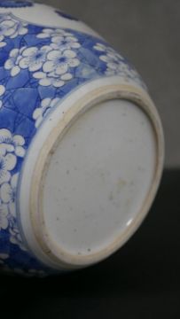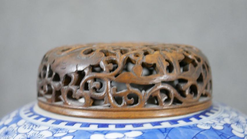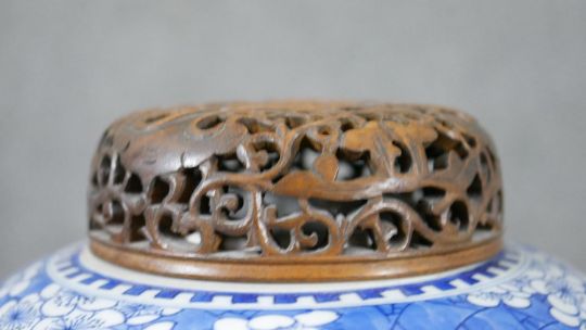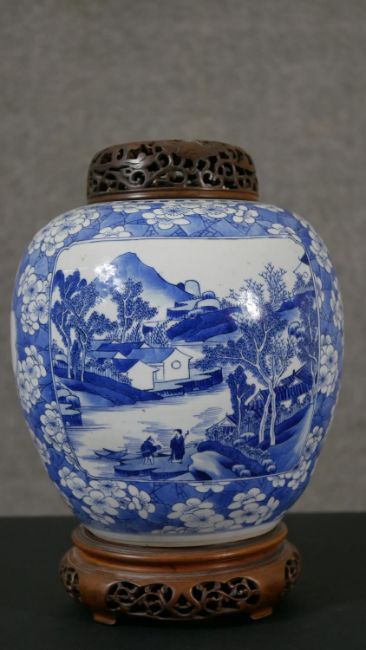 A Chinese blue and white porcelain vase of ovoid form, with two pictorial reserves, one depicting a landscape, the other a vase, scrolls and other items, the body decorated with prunus design, with a carved and pierced wood lid and stand. H.31 W.20cm
