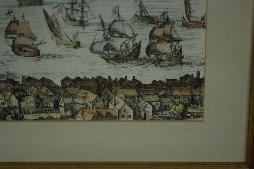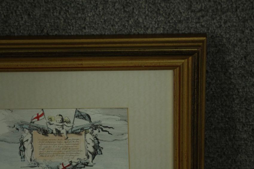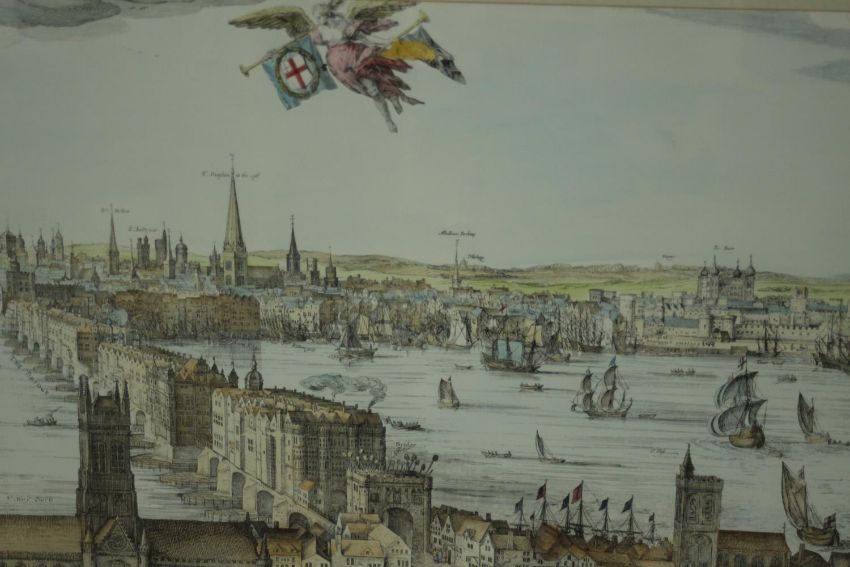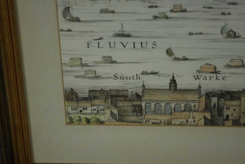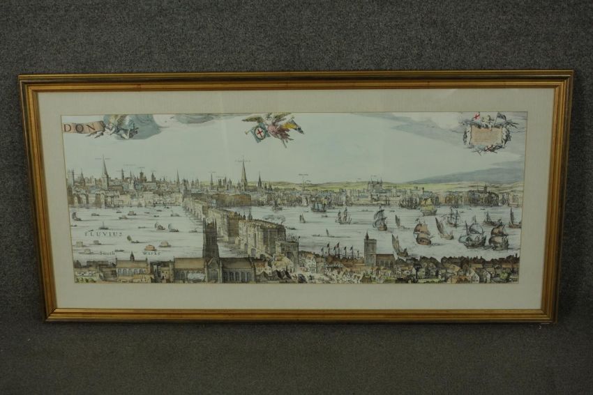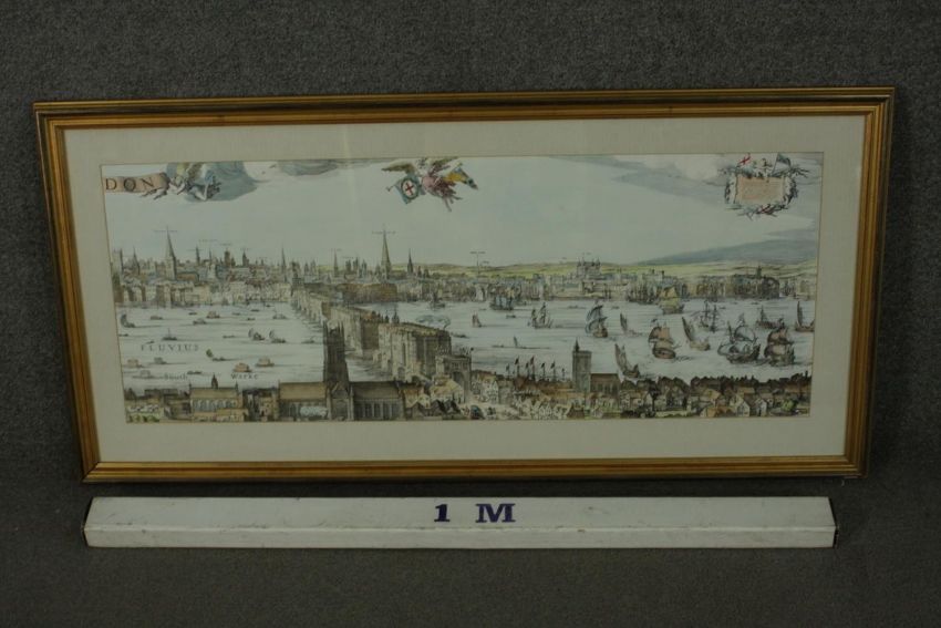 A large framed and glazed hand coloured engraving of a scene of the Thames with various places named. H.54 W.110cm.