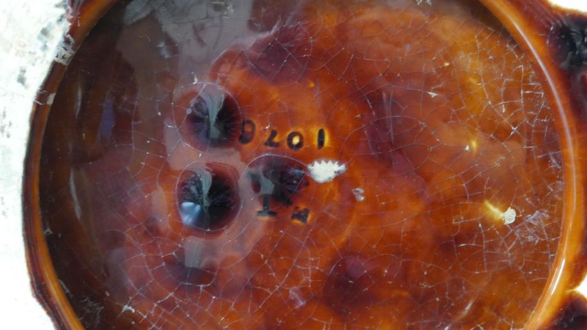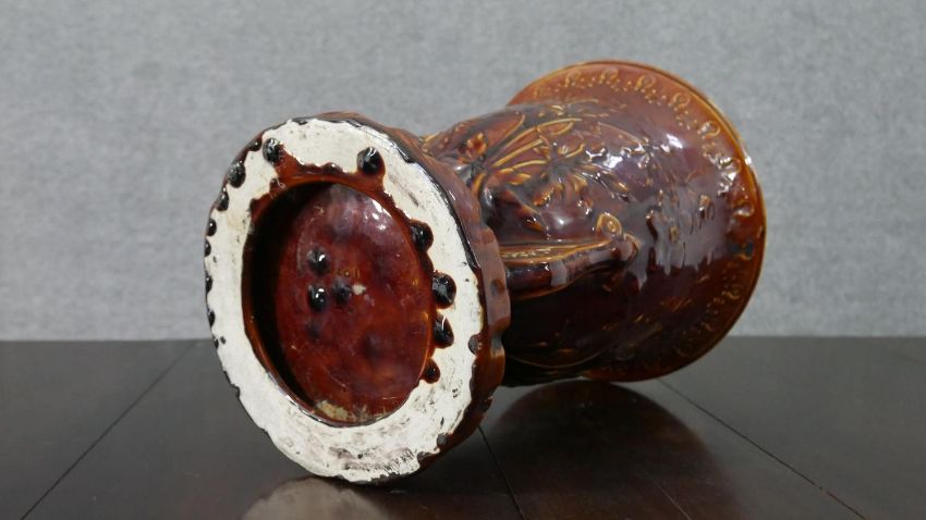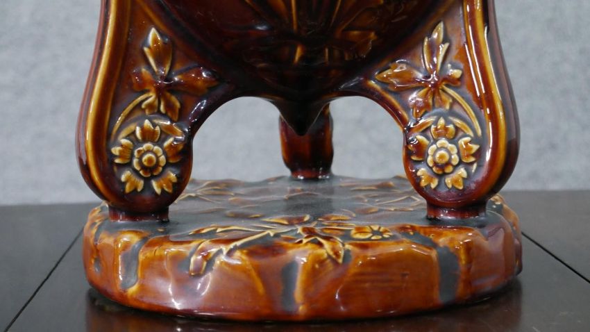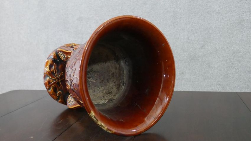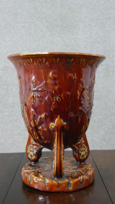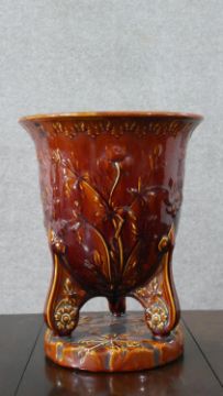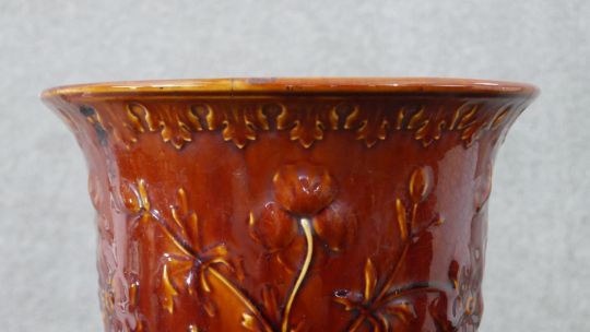 An Art Nouveau treacle glaze majolica planter with relief floral and foliate design. Impressed makers mark to the base. H.36 Diam.29cm