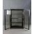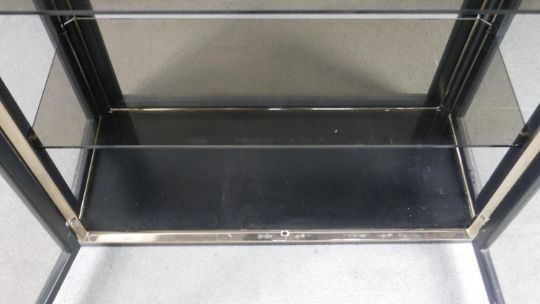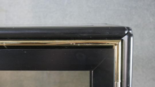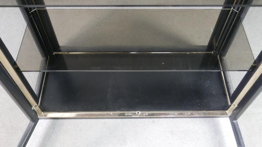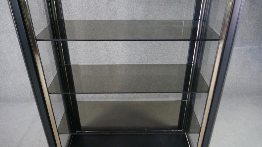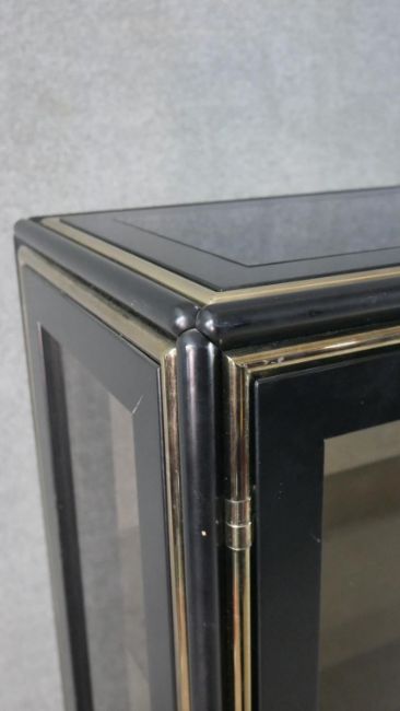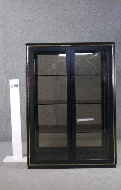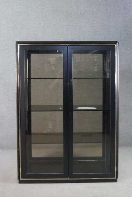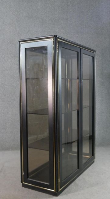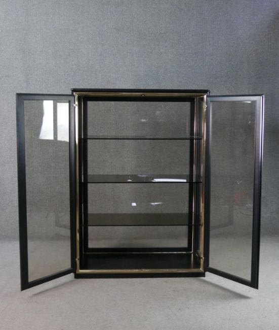 A circa 1970s ebonised and brass display cabinet, with two glazed doors, glazed sides and back, enclosing glass shelves. H.140 W.100 D.40cm