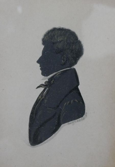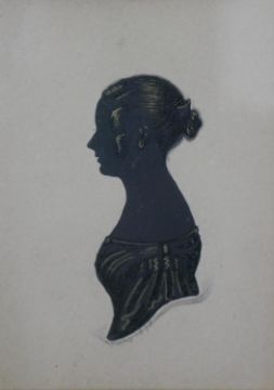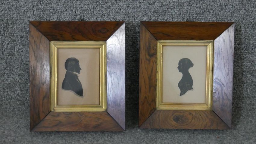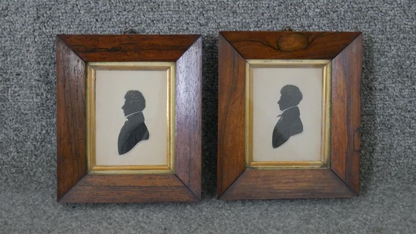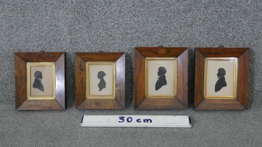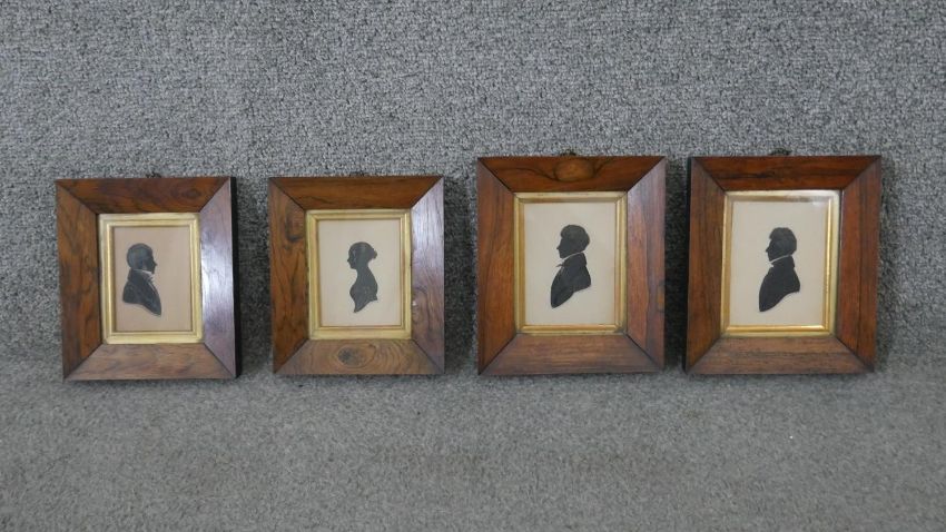Four framed and glazed hand painted shadow pictures of profile portraits. Each signed and dated. H.18 W.16cm (largest)