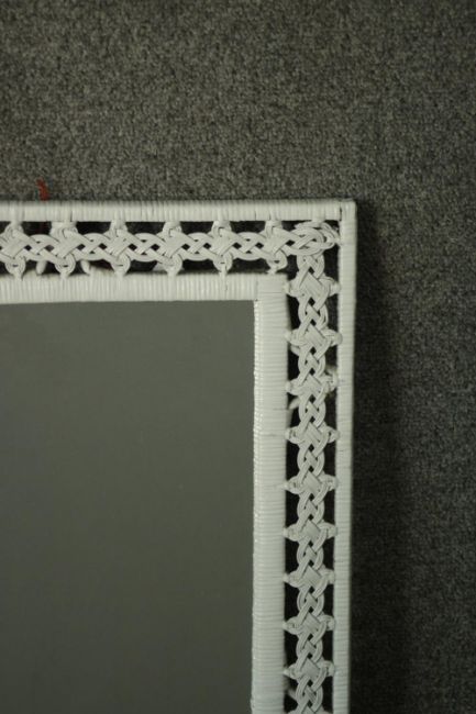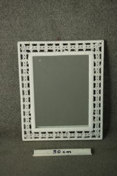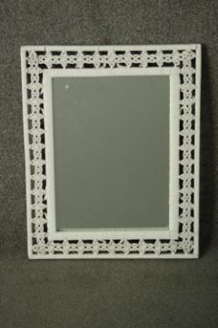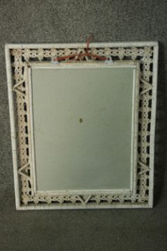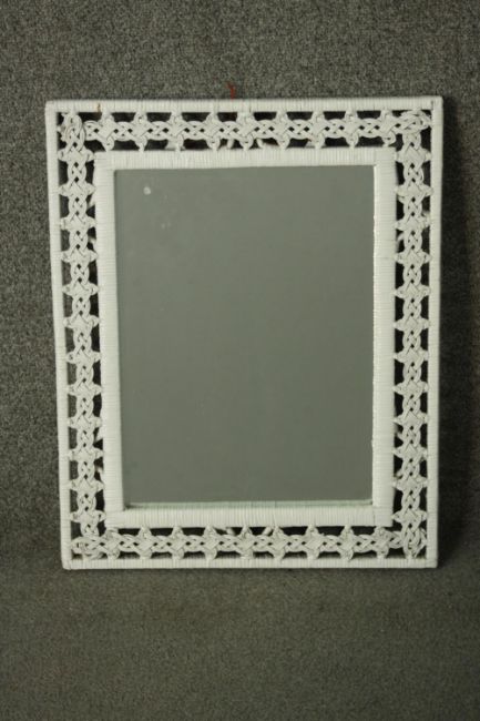 A white painted woven rattan framed mirror, with a rectangular mirror plate. H.53 W.43cm.