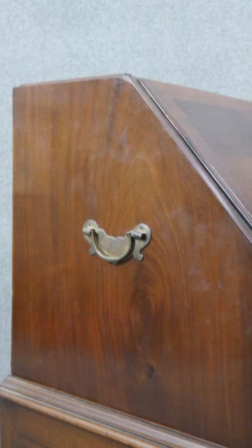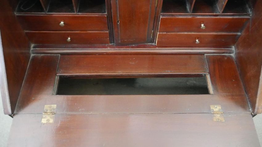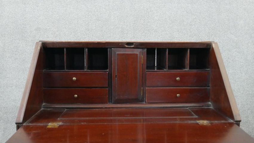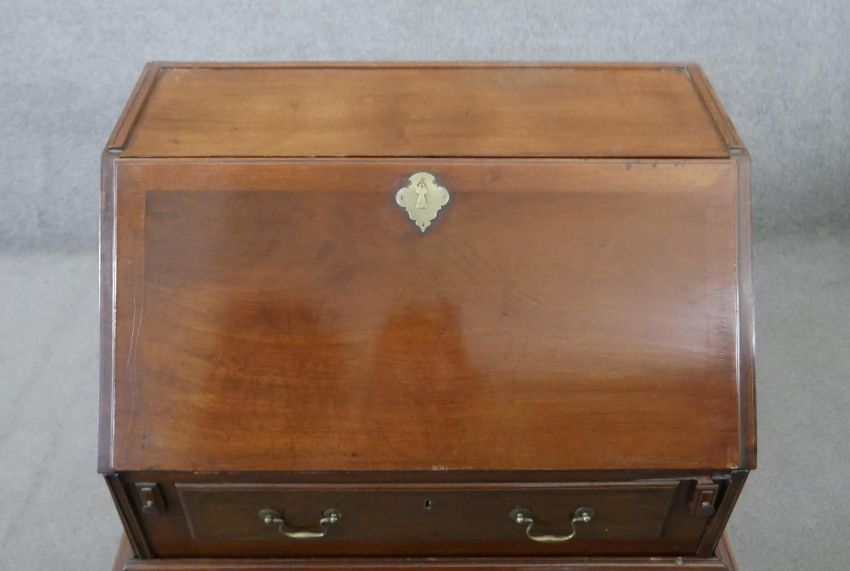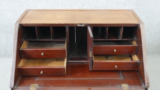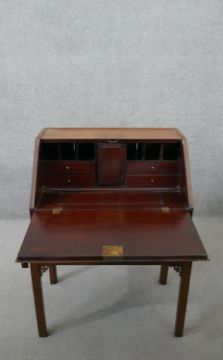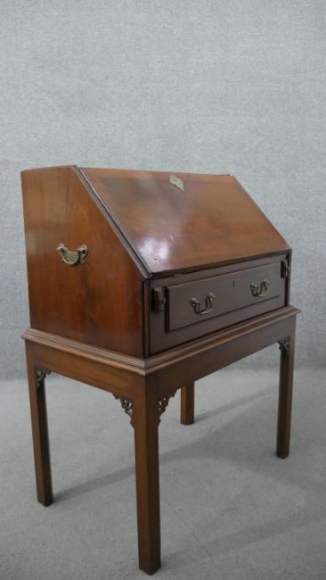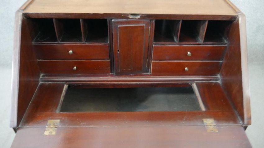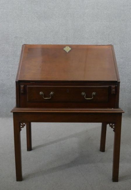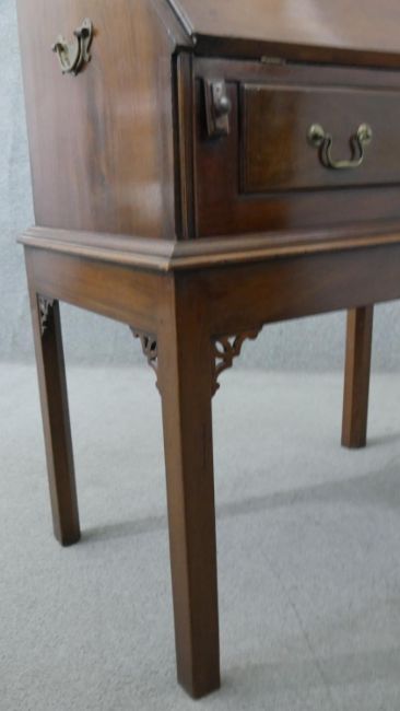 A George III mahogany bureau on stand, the fall front opening to reveal a central door, pigeonholes and four drawers over a well, above a drawer, on square section legs with pierced brackets. H.99 W.78 D.48cm
