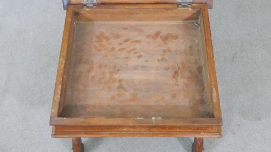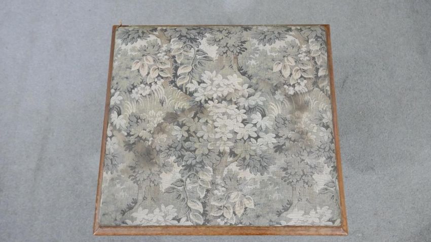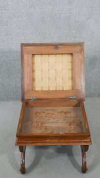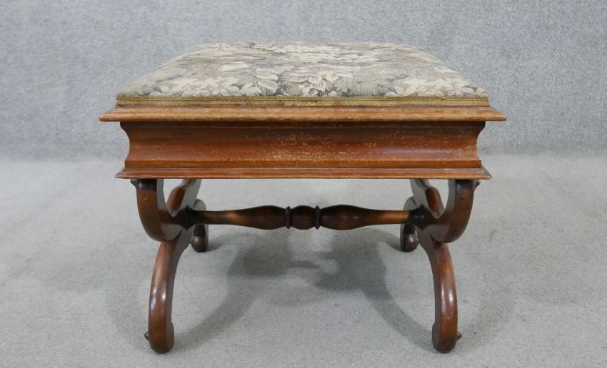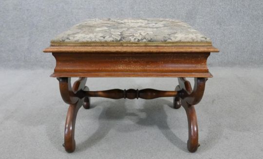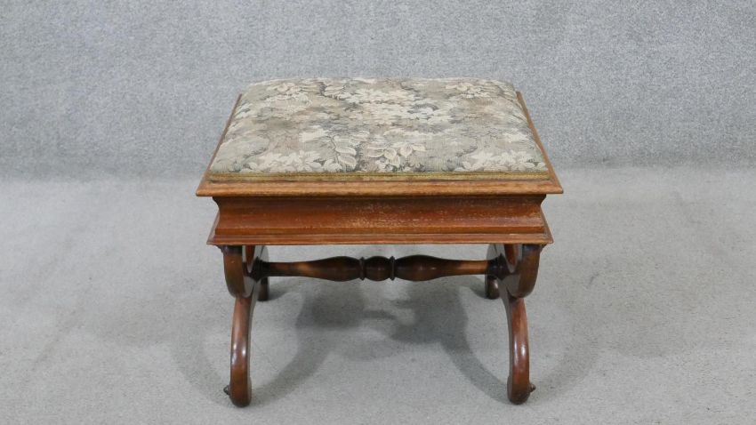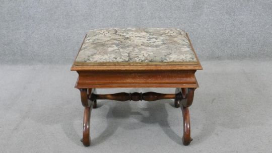 A Victorian walnut piano stool, the rising lid upholstered in machine made tapestry, on curved X frame supports joined by a turned stretcher. H.44 W.50 D.44cm