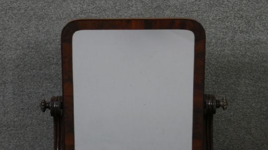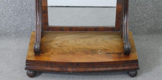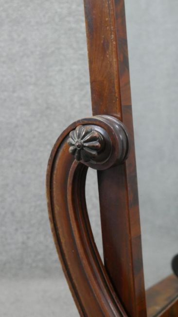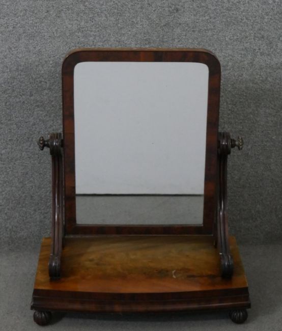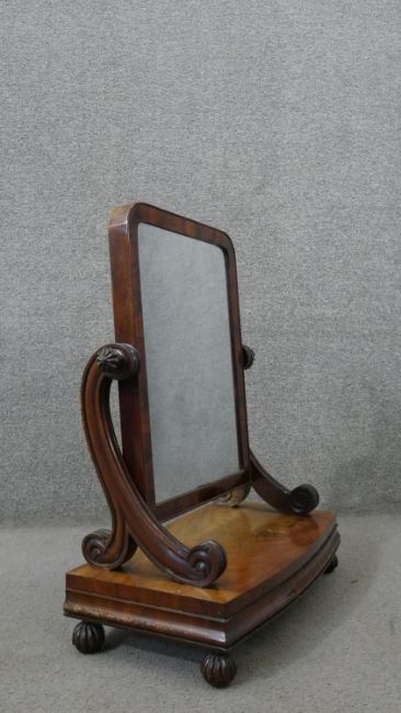 A William IV mahogany swing framed toilet mirror, the rectangular mirror on scrolling supports, the bow front base on lobed ball feet. H.67 W.55 D.25cm