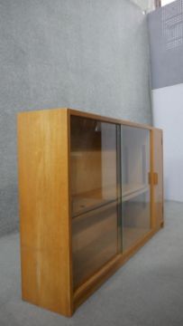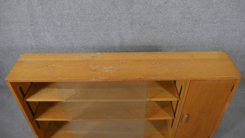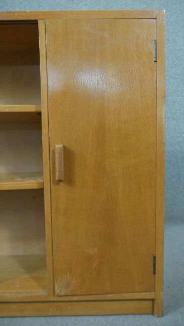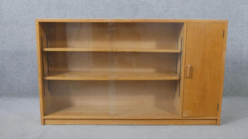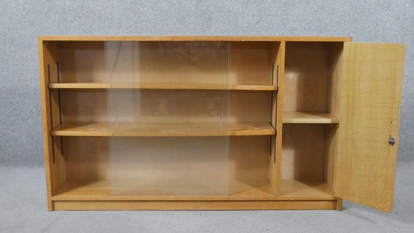 A 1960s light oak glazed Criterion bookcase, with two glass sliding doors enclosing shelves, one cupboard to the side, on a plinth base, bearing maker's labels 'Criterion' and 'Phoenix of Charing Cross' to the interior. H.80 W.136 D.25cm