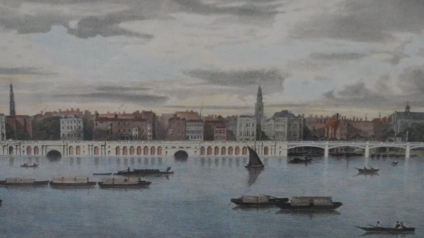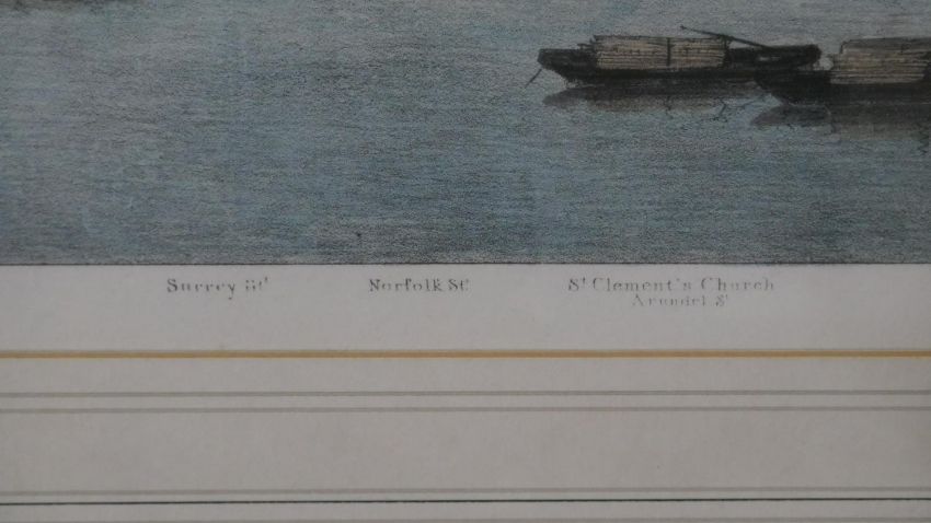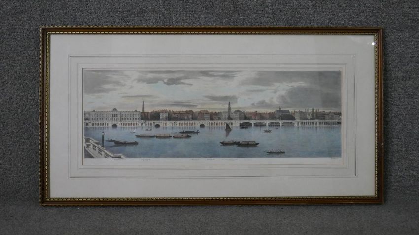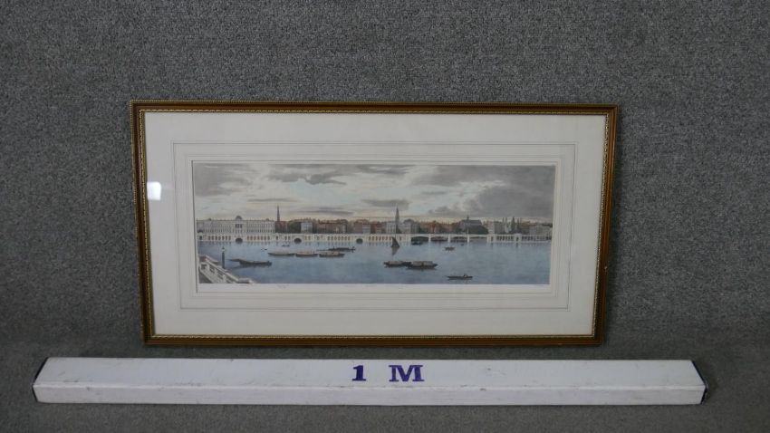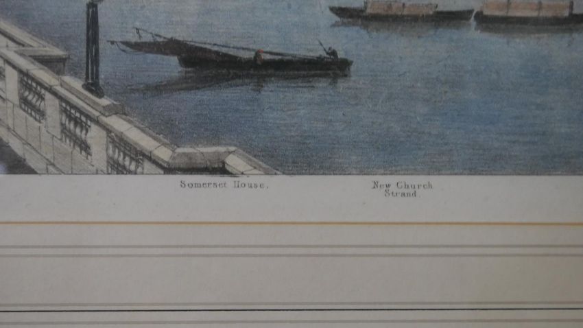 A large framed and glazed hand coloured engraving of the Thames. H.40 W.76cm