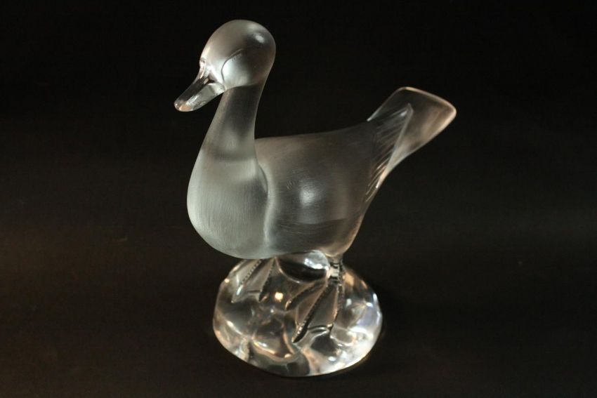 A Lalique crystal frosted and clear glass duck figure, standing on a round crystal base, signed Lalique, encircled R, France in the border of the base. H.25 W.27cm.