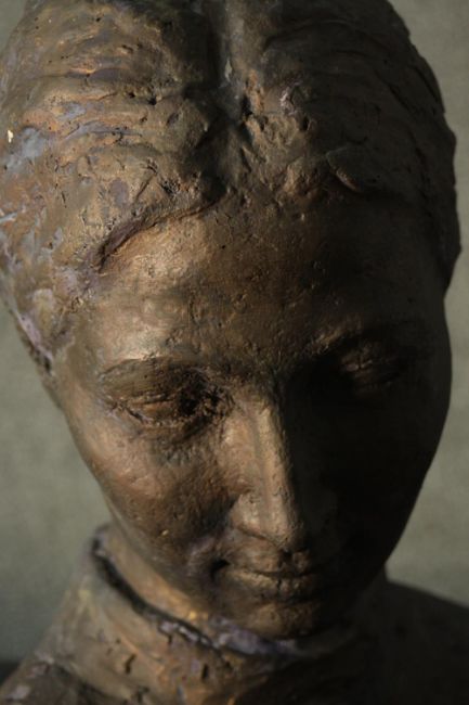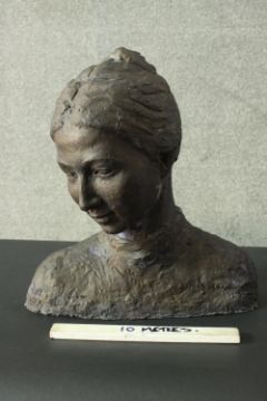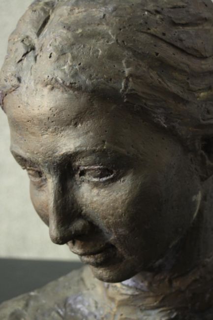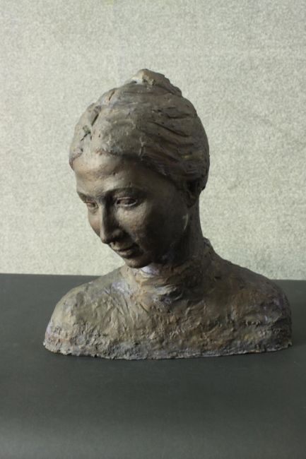 A bronze effect resin and concrete bust of a young female with hair in a bun, unsigned. H.48 W.43cm.