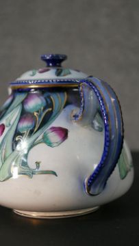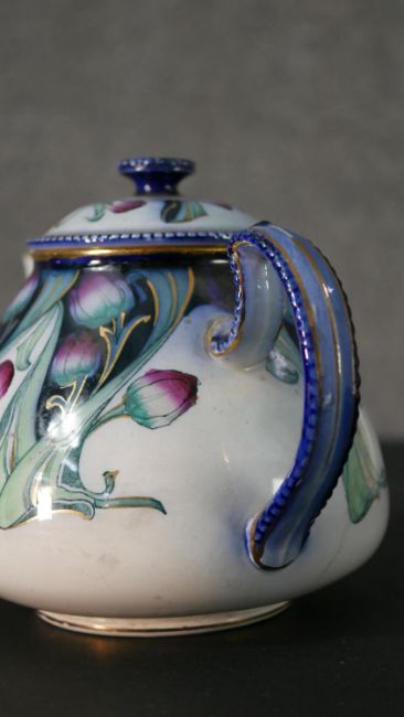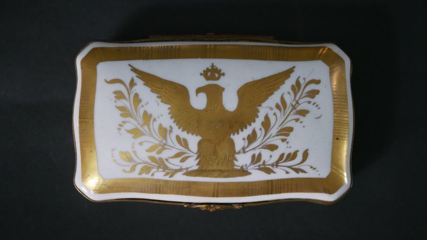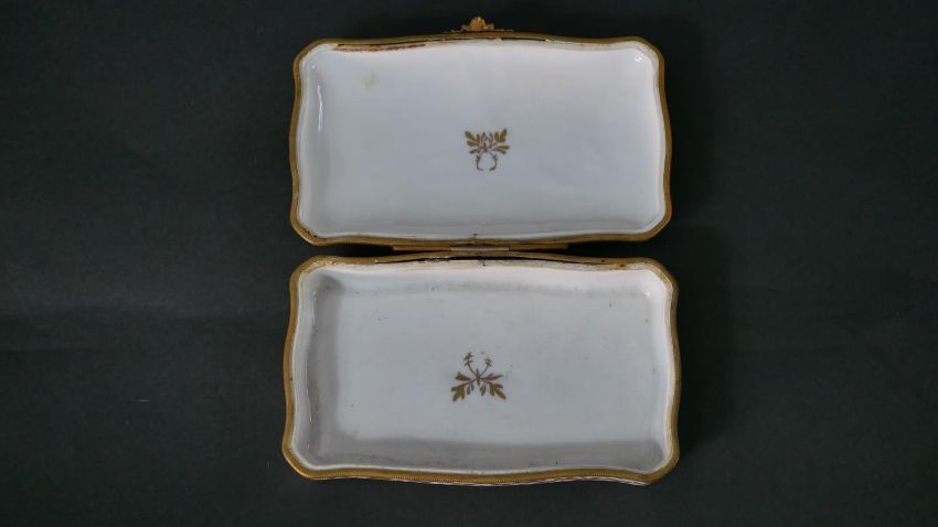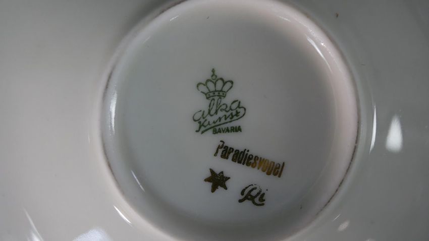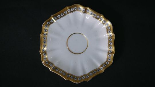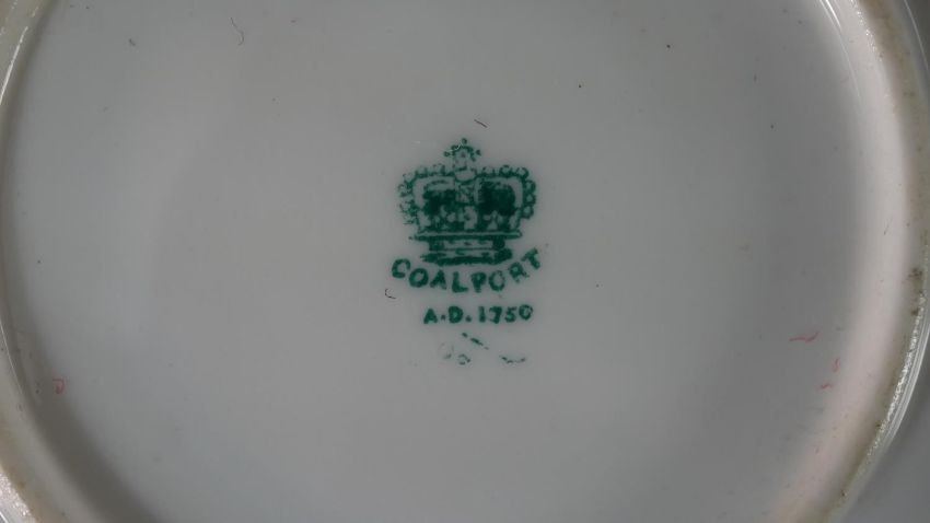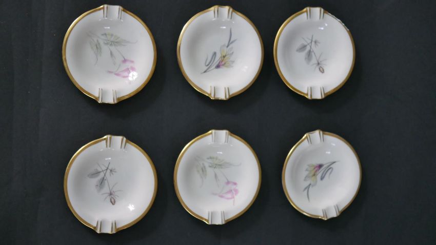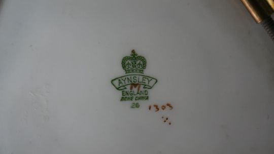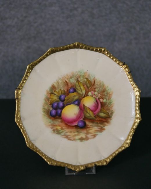 A collection of hand painted fine porcelain, including a Vincennes Limoges French porcelain trinket box with a gold eagle, a Coalport saucer, a Burleigh ware florette tea pot, an Aynsley hand painted fruit plate with gilded rim and six floral design ashtrays. Maker's mark to the base. H.16 W.23cm (largest)