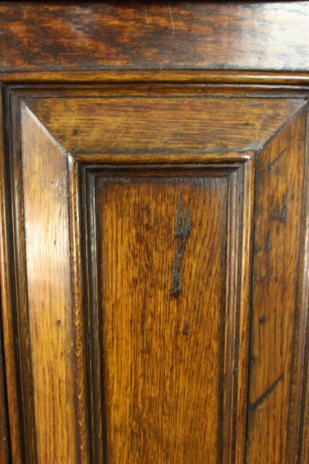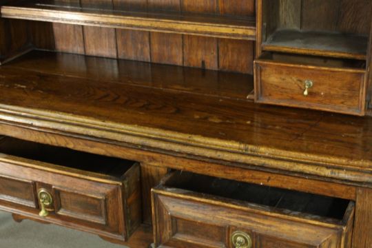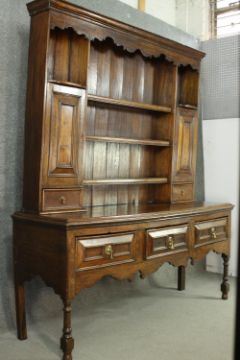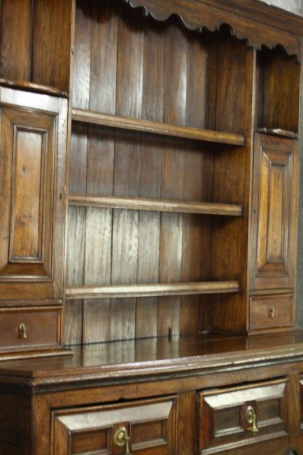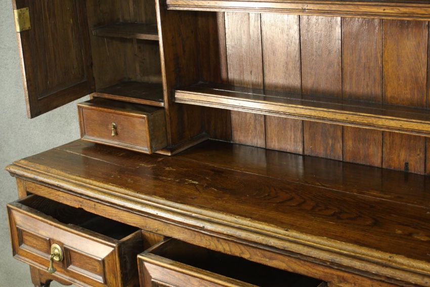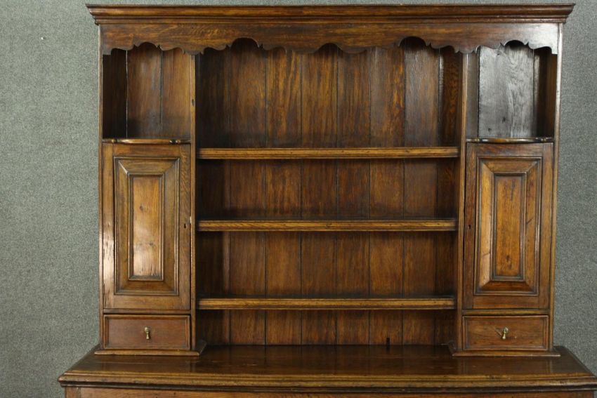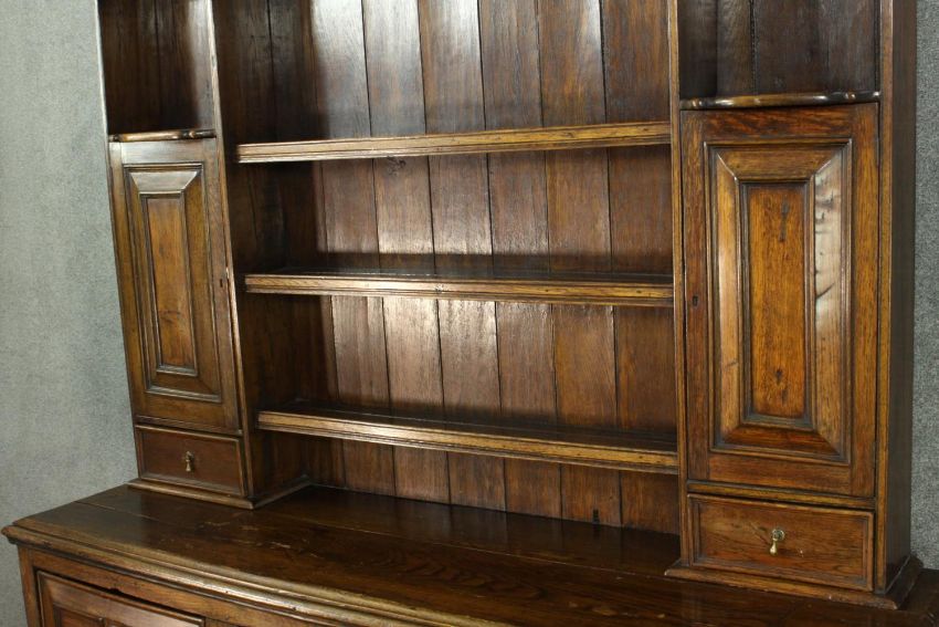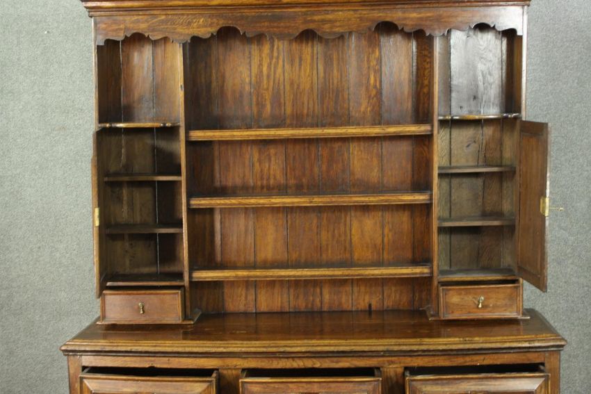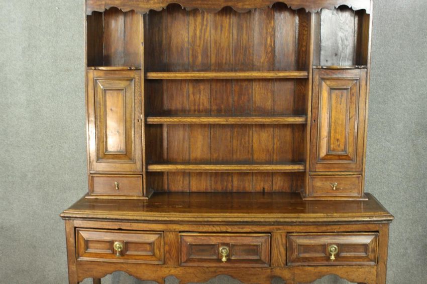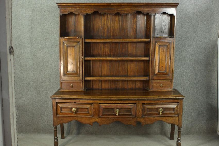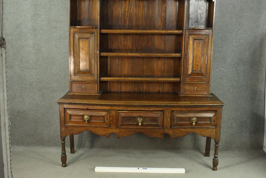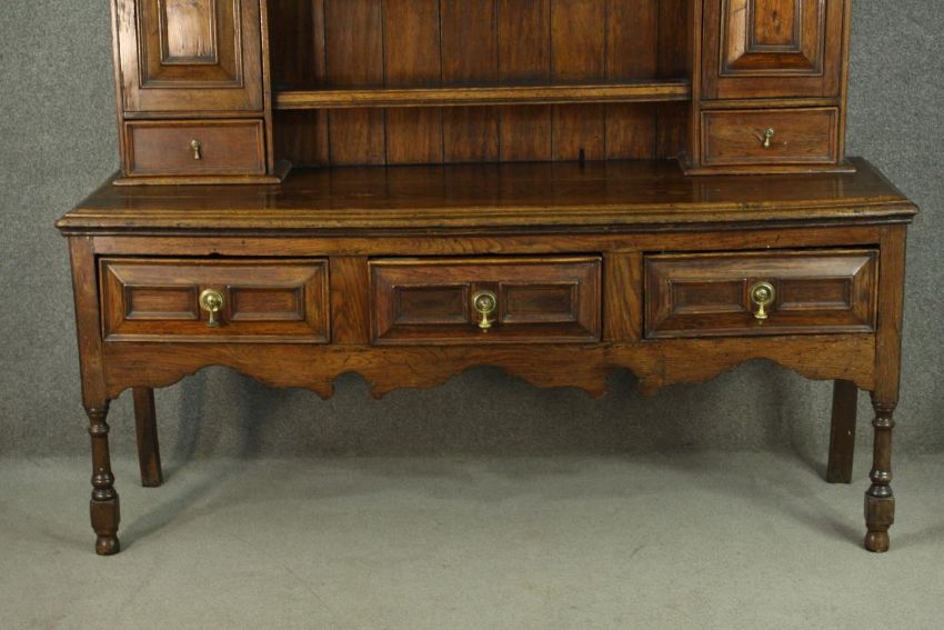 An 18th century country dresser, with three shelves flanked by two panelled cupboard doors and two short drawers, over three short drawers, above a shaped apron, on turned legs. H.202 W.180 D.50cm.