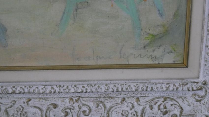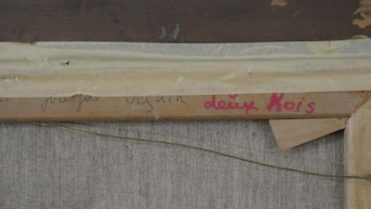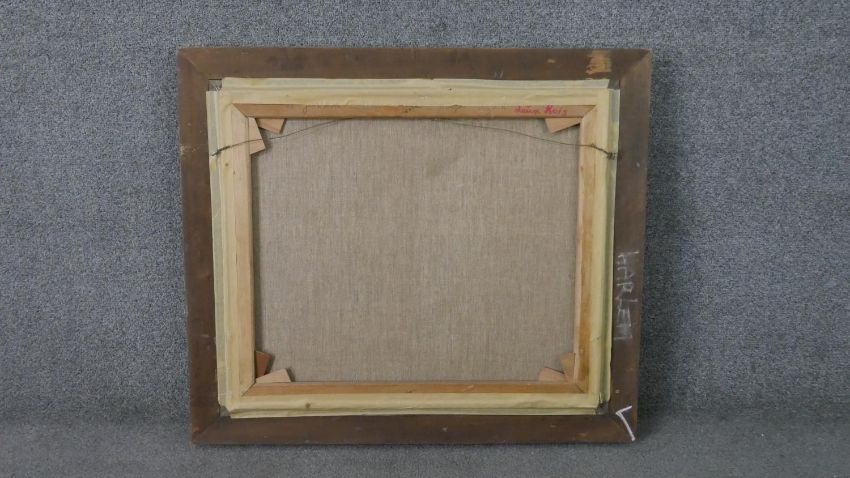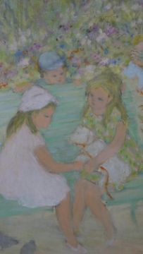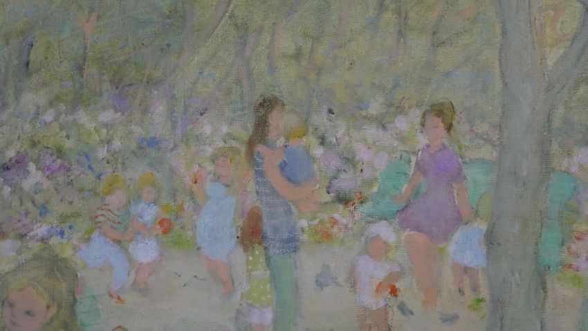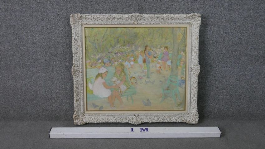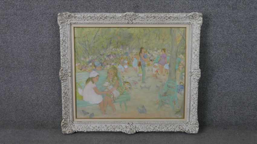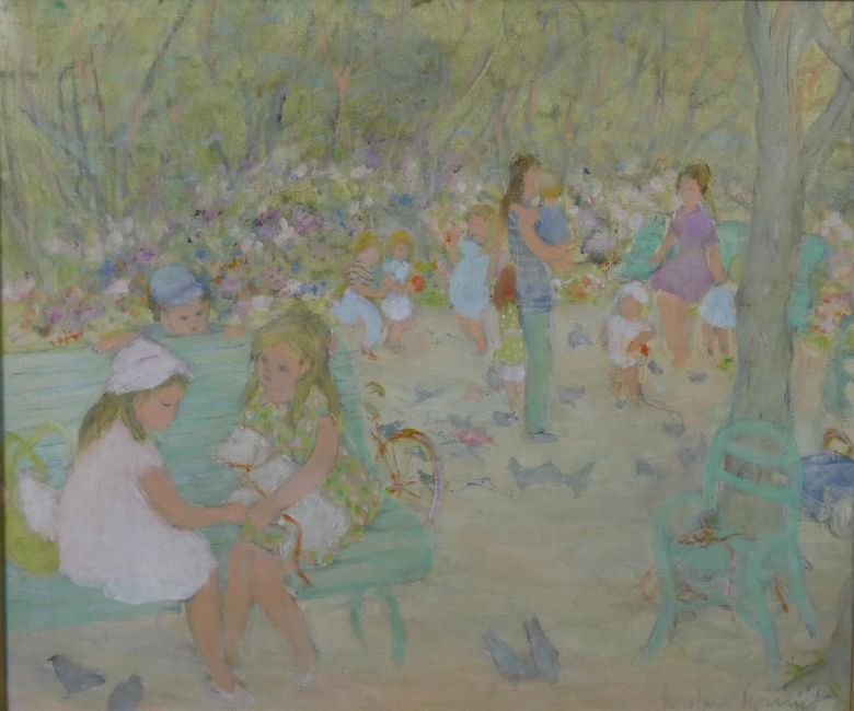 Jocelyne Seguin, French, (1917 - 1999), Oil on canvas, people in the park, signed bottom right and verso. H.69 W.78cm