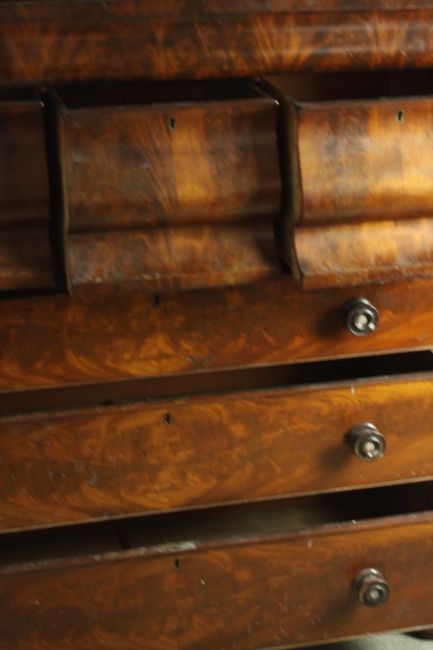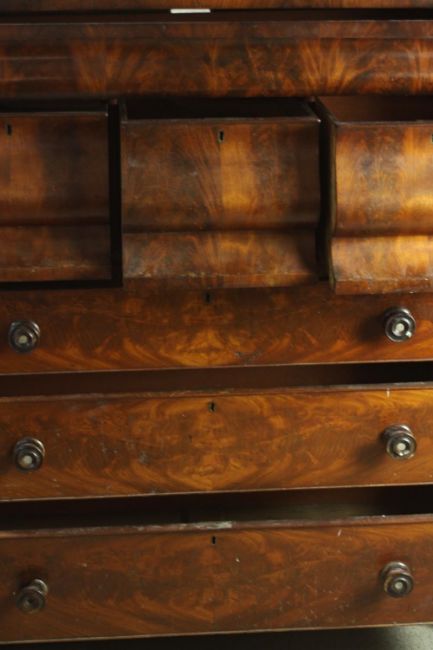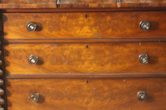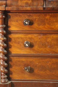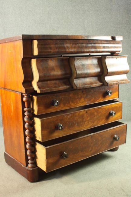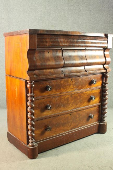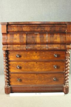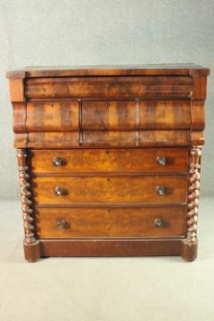 An early Victorian Scottish mahogany chest, with a cushion drawer over three hat drawers, above three long graduated drawers, flanked by barley twist columns, on a plinth base. H.130 W.120 D.55cm.