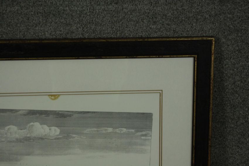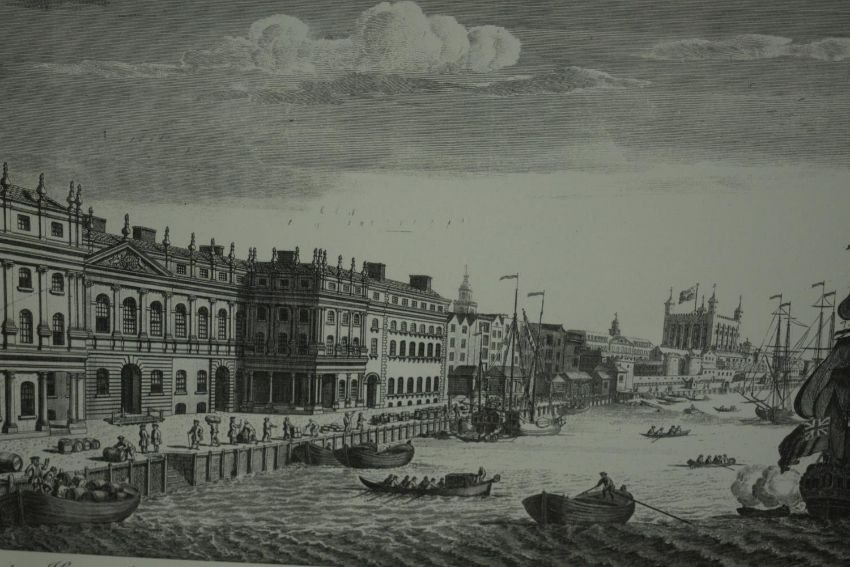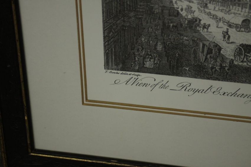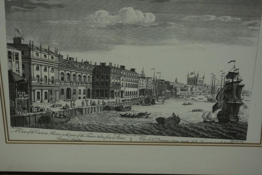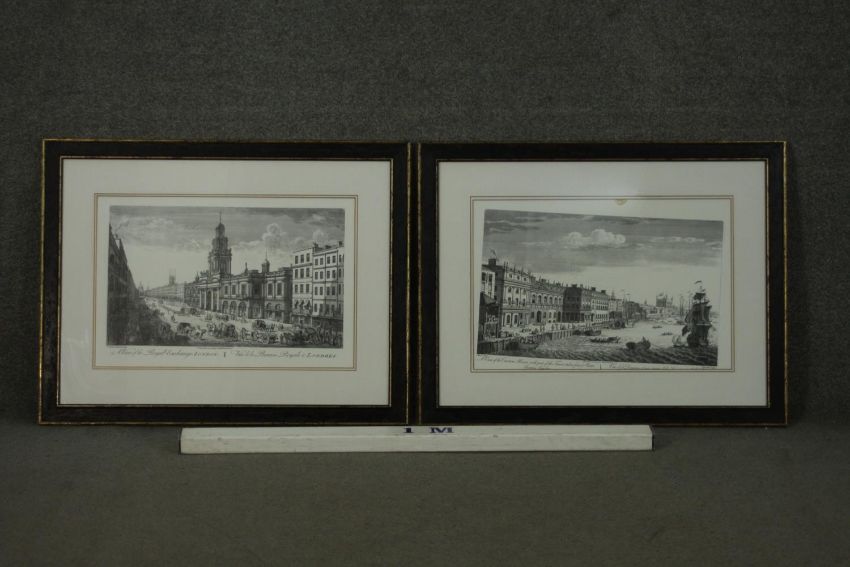 Two framed and glazed 19th century engravings, one of A view of the Royal Exchange and A view of the Custom House with part of the Tower. H.63 W.80cm. each.