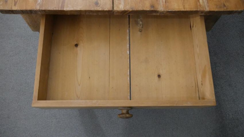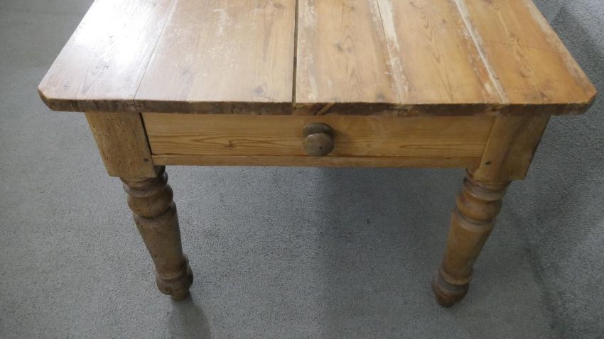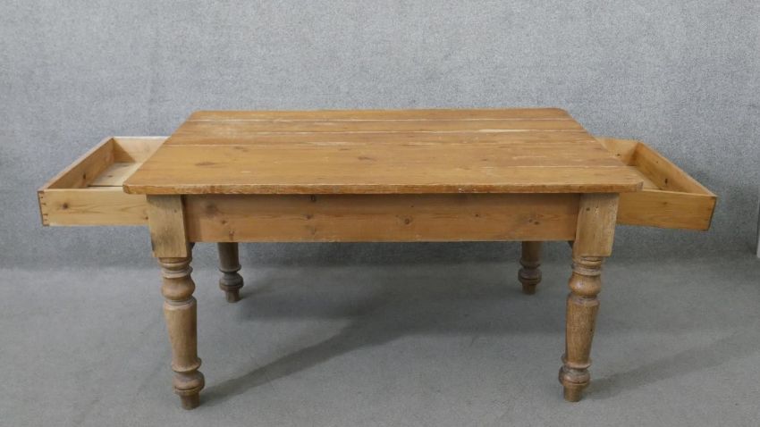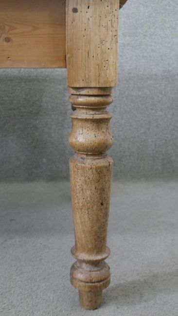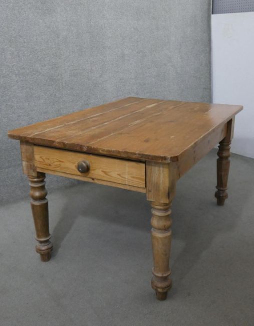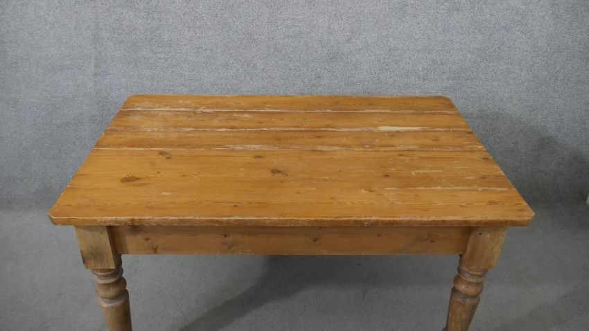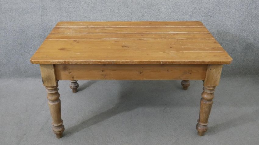 A Victorian pine kitchen table, the rectangular plank top over an end drawer with a knob handle, on turned legs. H.73 W.137 D.88cm