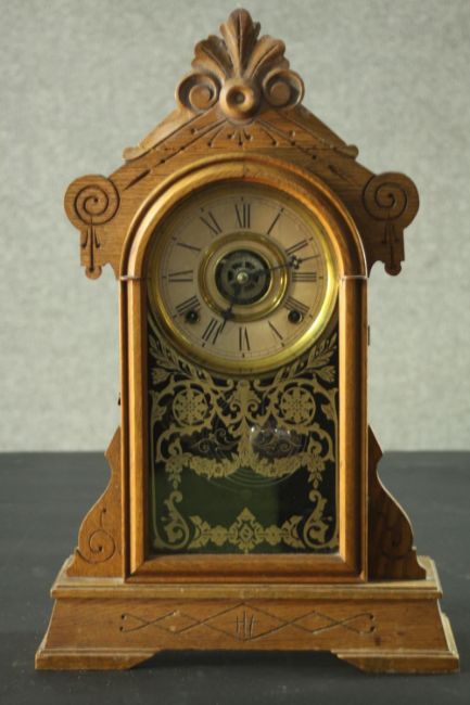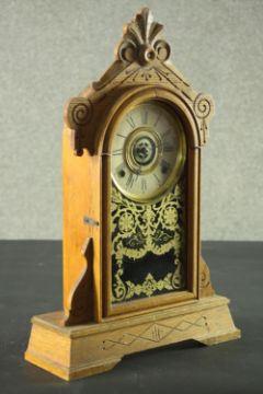 A late 19th century American Ansonia type oak cased mantel clock with eight day movement. H.52 W.28 D.12cm.